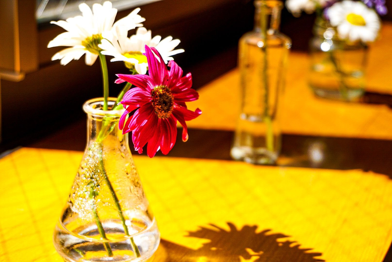 職場の窓際に飾ってあった花が夕陽があたって綺麗だったので、手を休めて1枚撮りました。