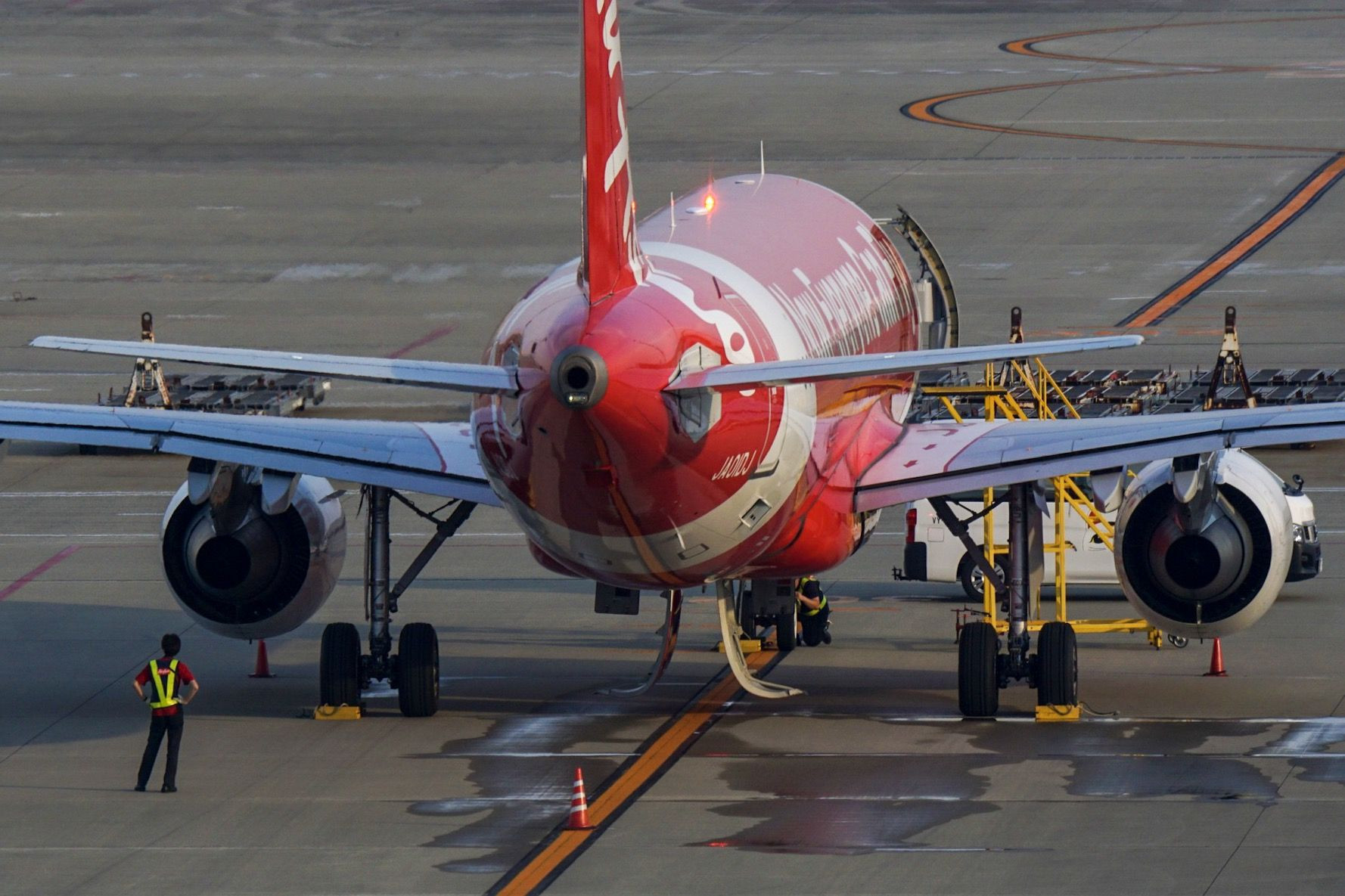 セントレアでの夕方の出来事 2人の整備士さんがエアアジアの機体を点検してたら いい光線がでてきたのでつい撮ってしまいました