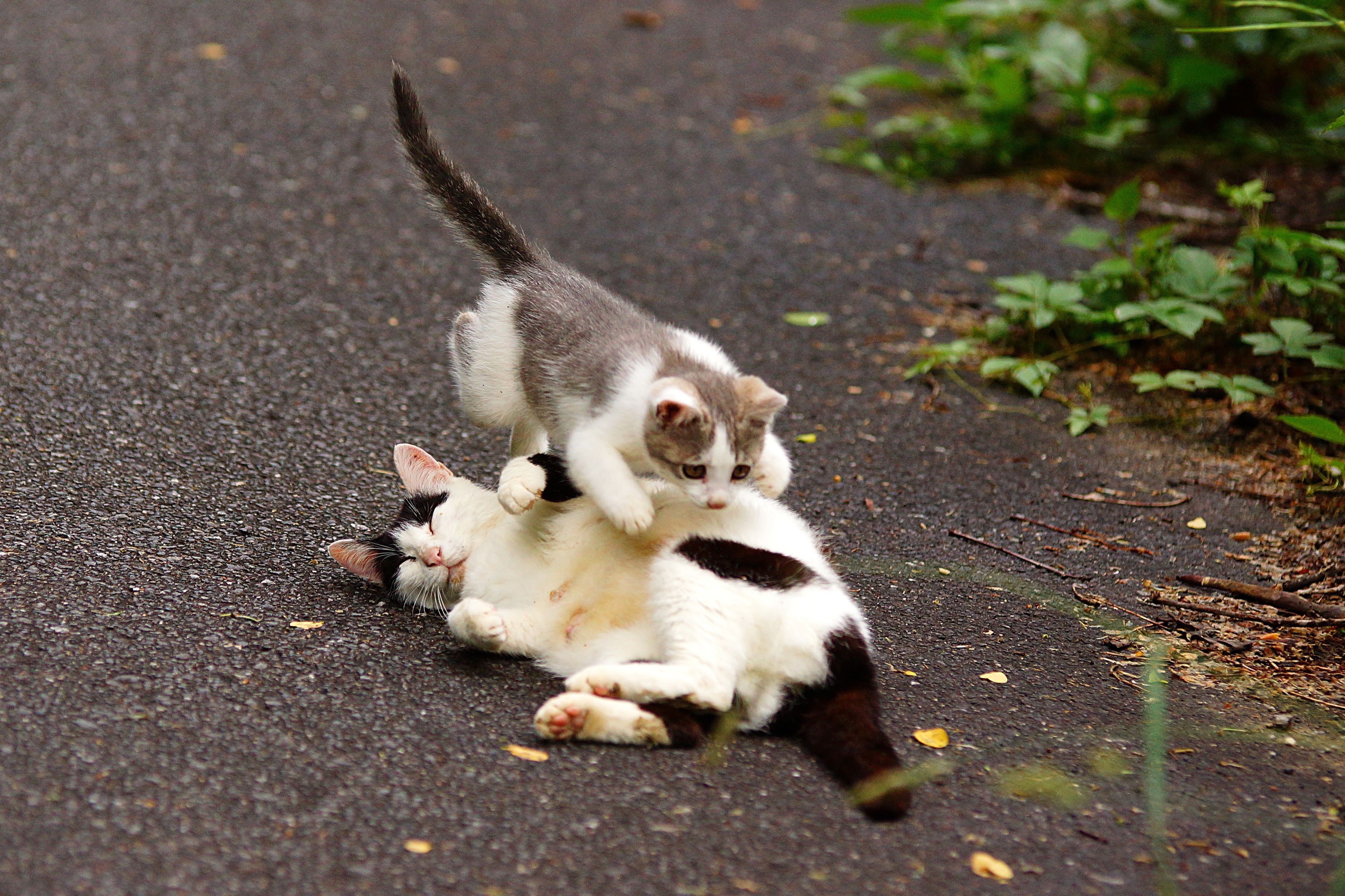 おもちゃがわりになっているおかあさんのしっぽめがけて飛行するサバ白くん