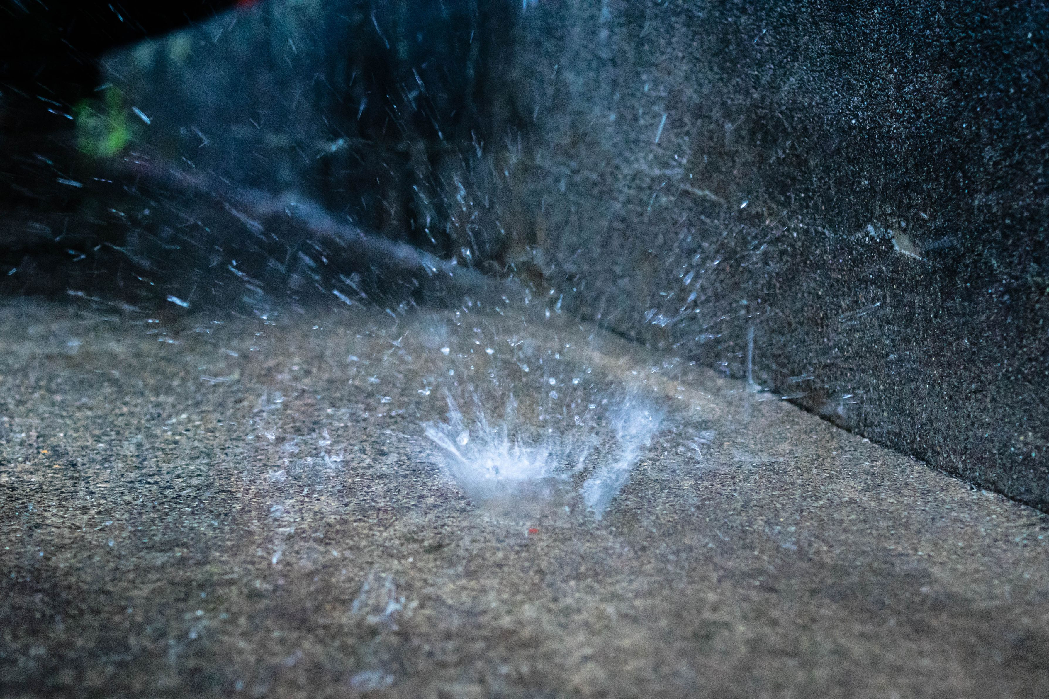 雨樋から流れてきた水が、地面で弾けていました。