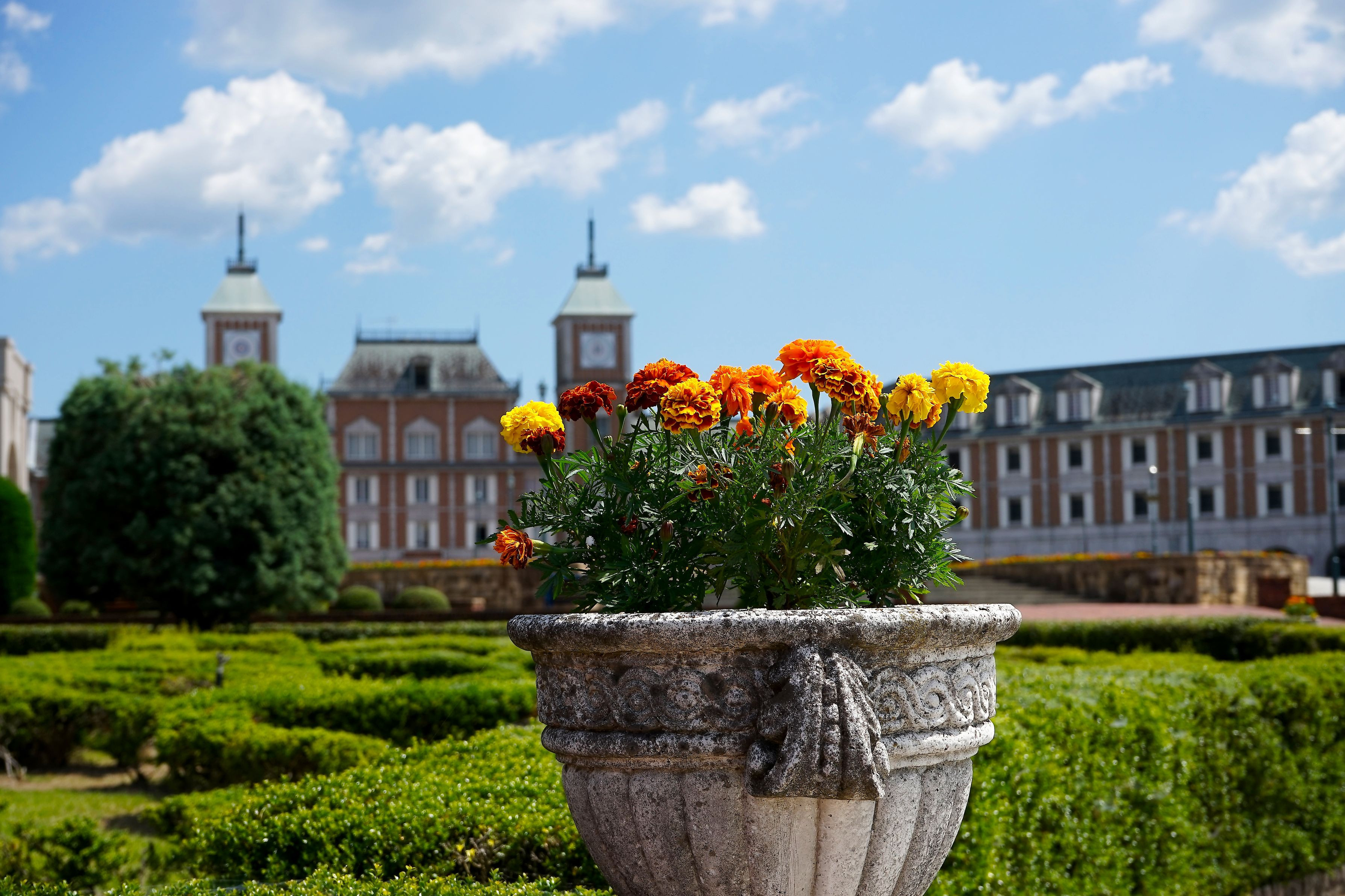 洋風ホテルと花壇