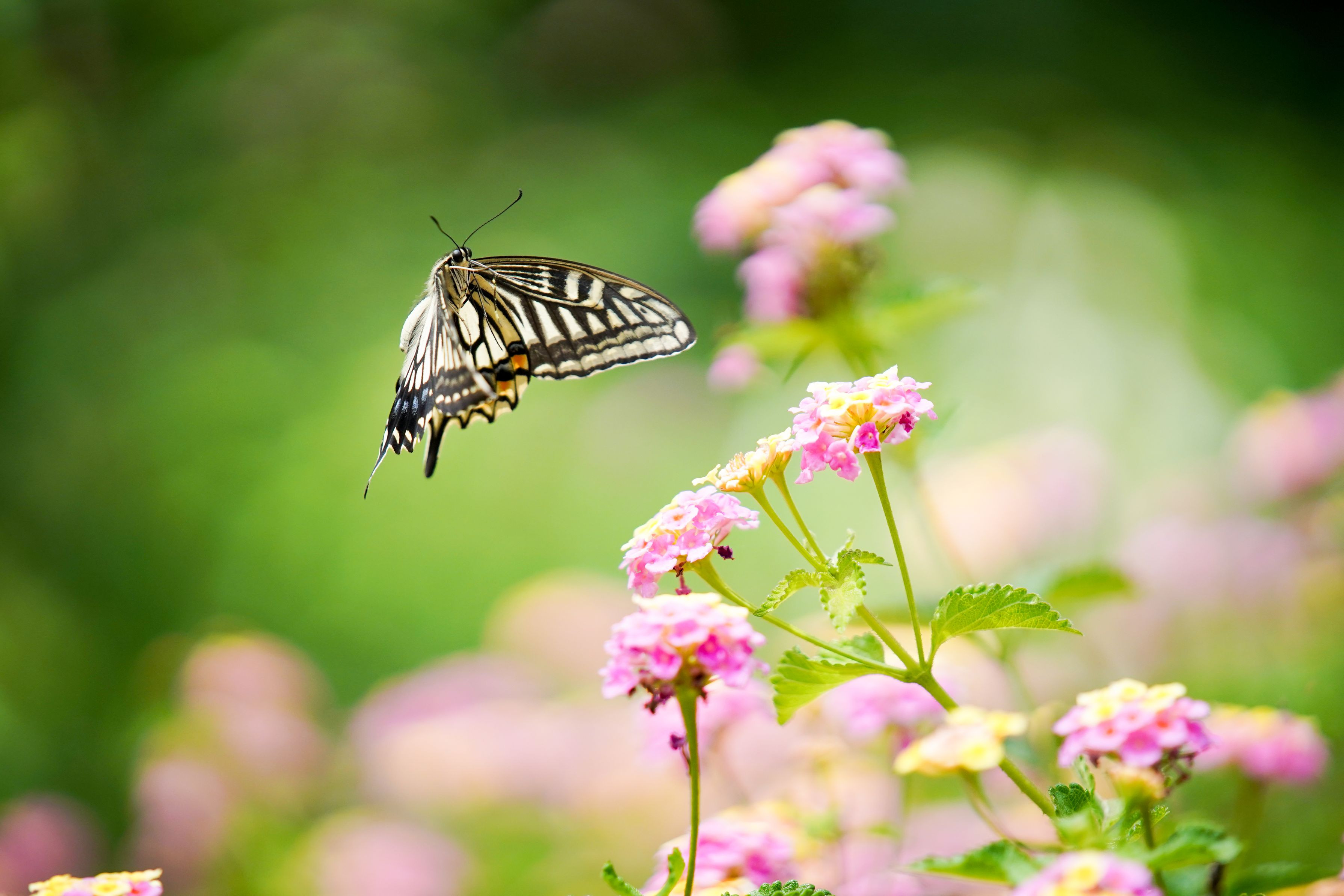 飛びながら吸蜜するアゲハチョウ