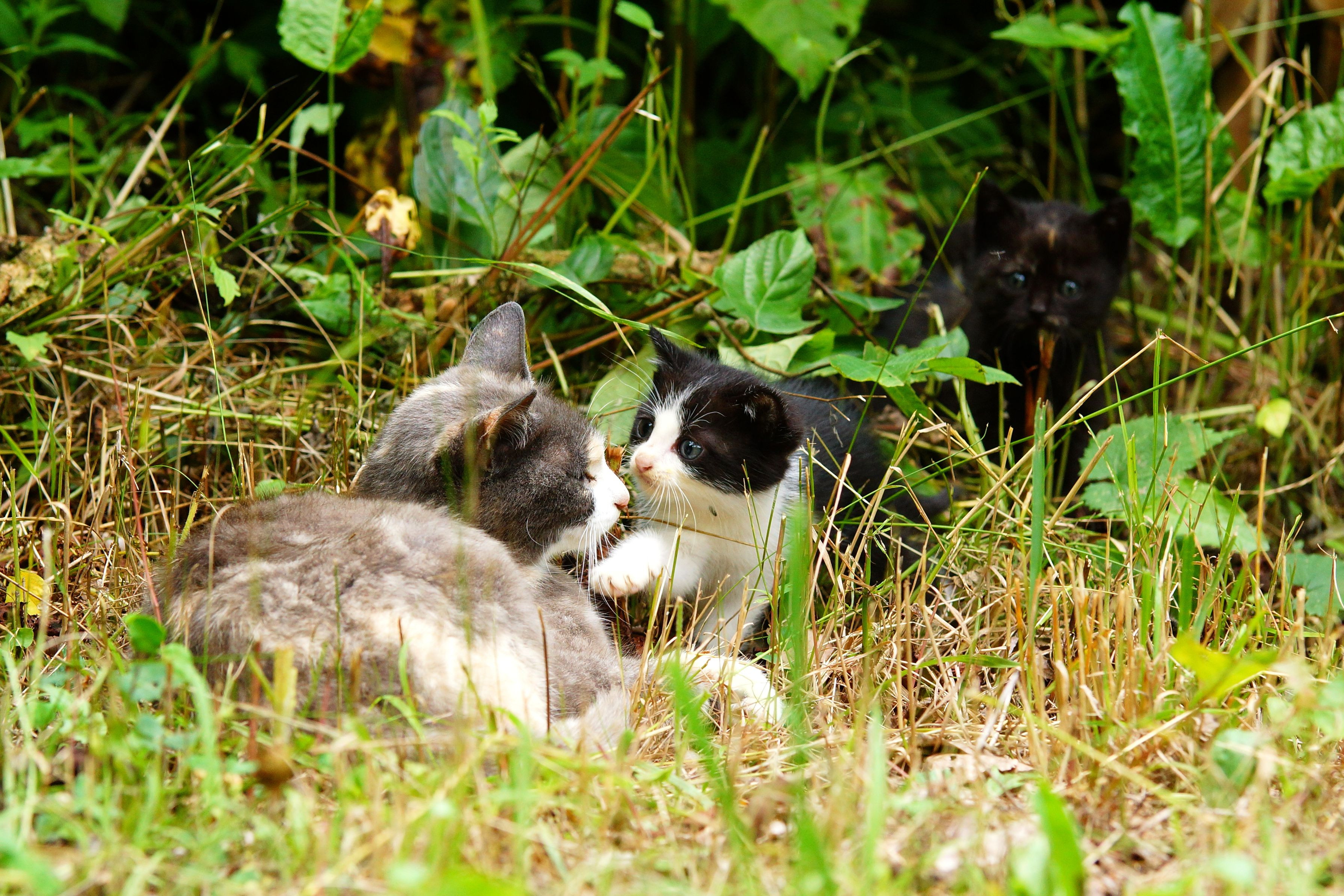 ぜひ、拡大してご覧ください。 ”子猫の季節”の子猫たちのおねえちゃんのパステル三毛さんがおかあさんになってました。 ついこの前まで子猫だと思っていたのに、猫の成長は早いですね。 編集していて初めて気付きましたが、後ろにも黒サビちゃんがいます。 この子たちは生後1ヶ月くらいだと思います。”