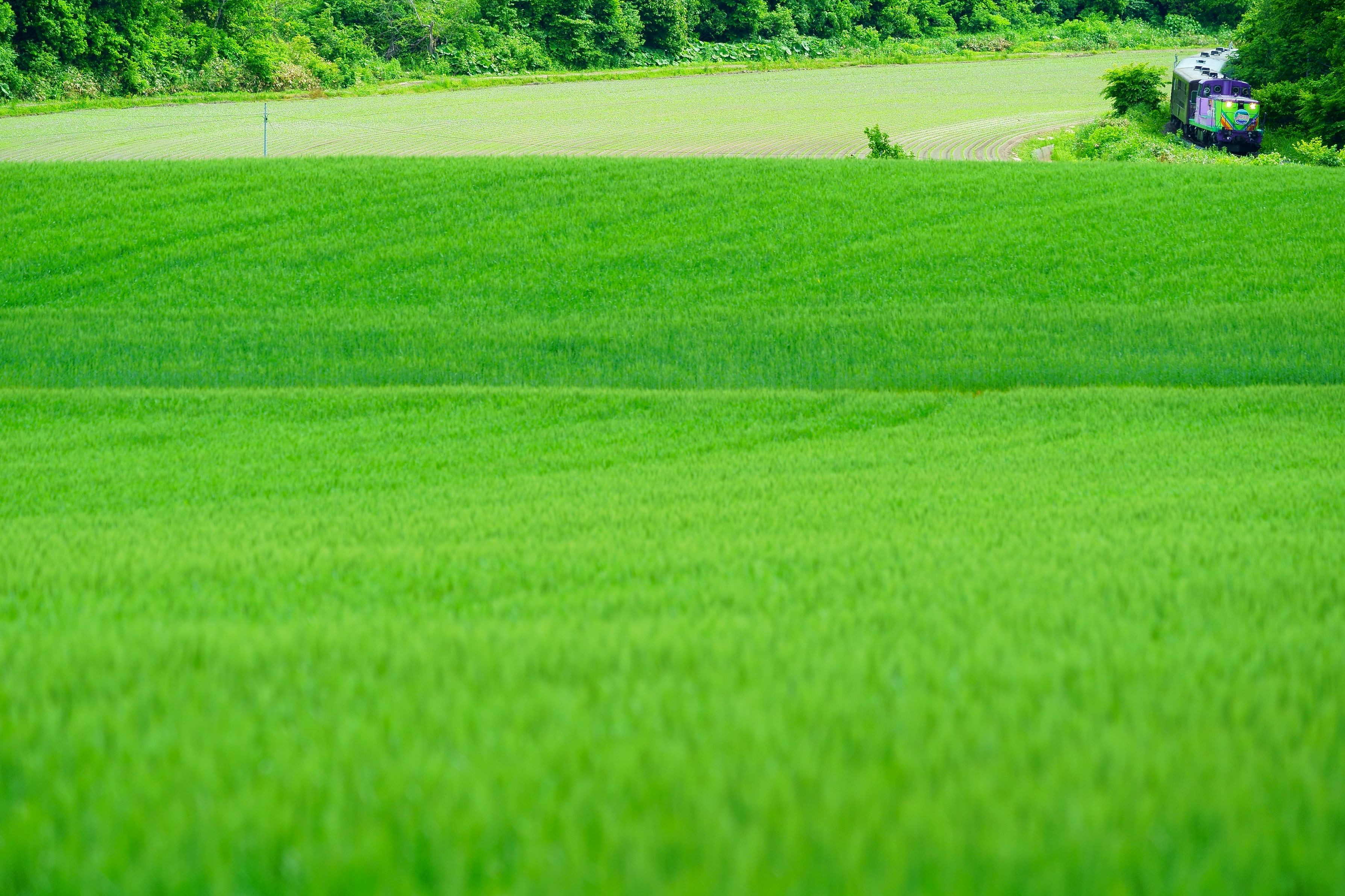 青々とすくすく生長する麦畑に出会う。 「富良野・美瑛ノロッコ号」がそんな麦畑を噛みしめるように走り抜ける。 (富良野線 美馬牛~上富良野)