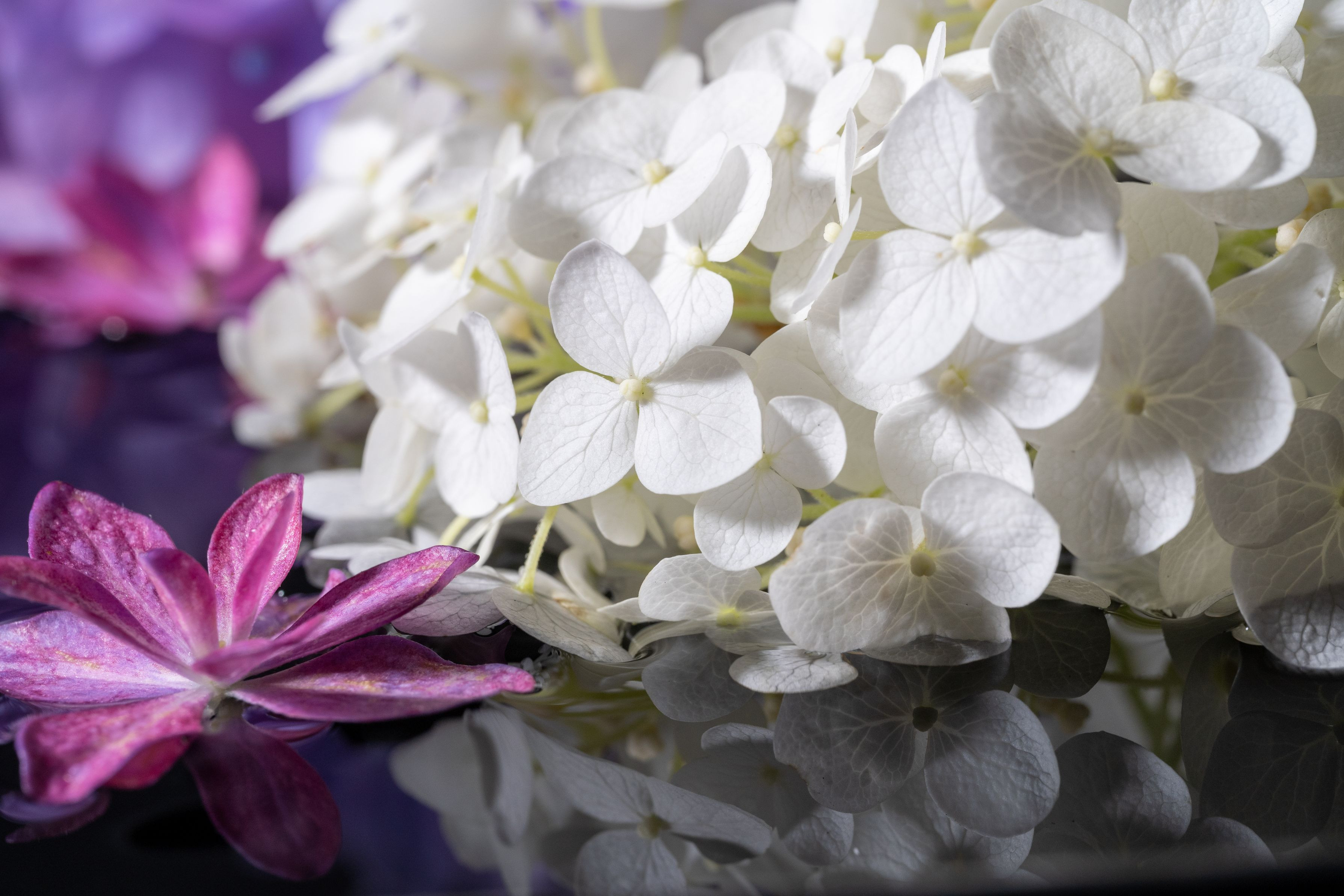 白い紫陽花をメインに、水に浮かべた紫陽花を撮ってみました。