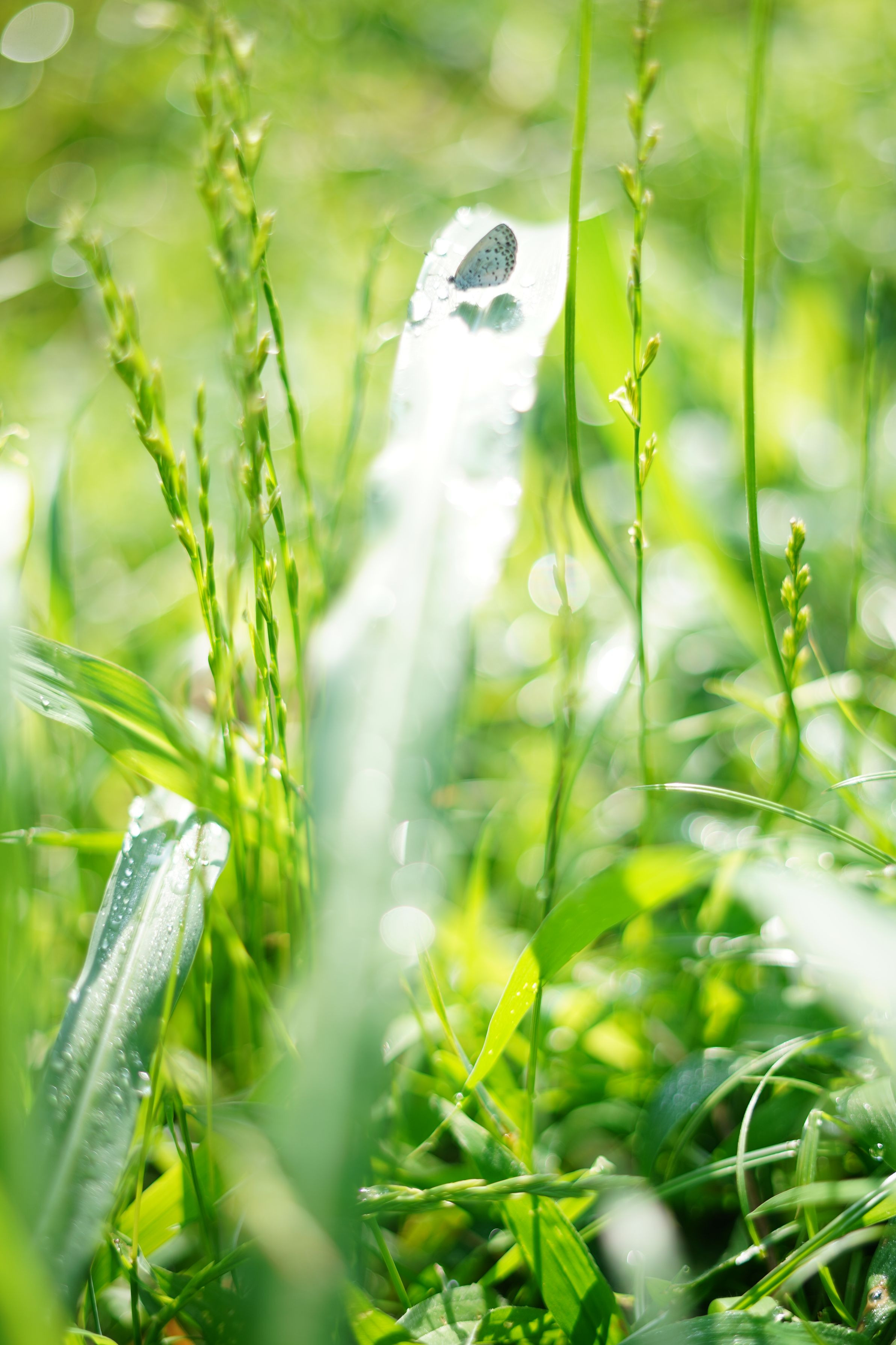 雨が上がった翌日の早朝。近くの公園で。ちょうちょが一羽葉っぱの上で気持ちよさそうに羽を乾かしてました♡