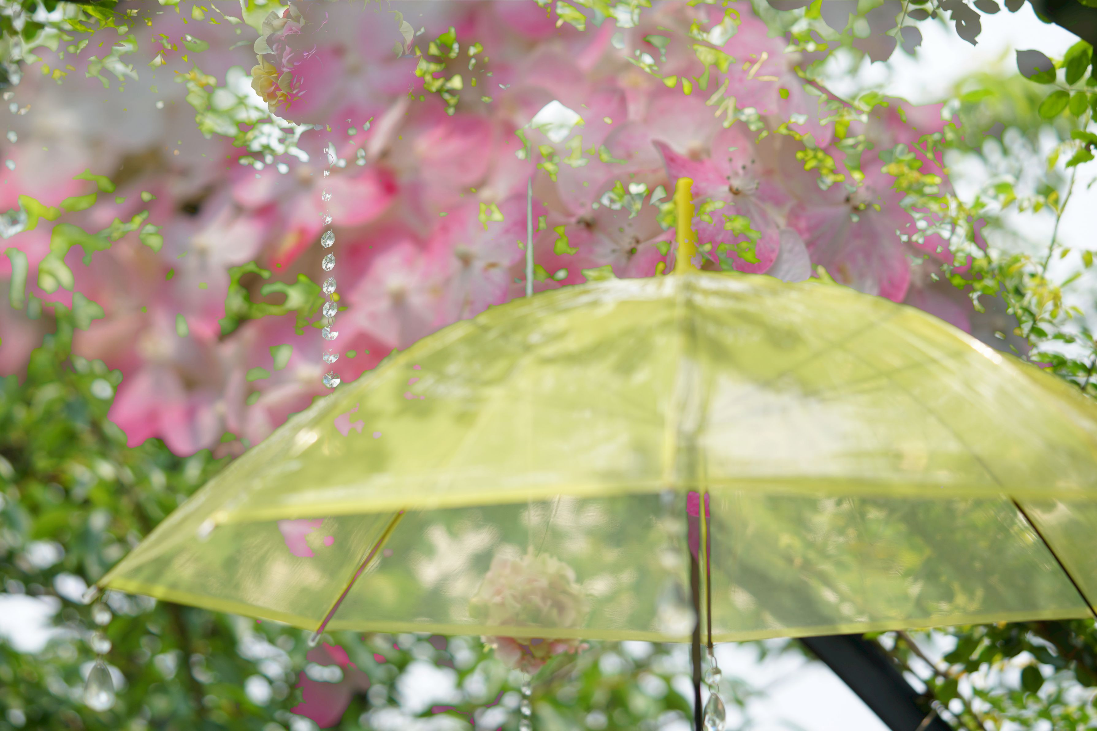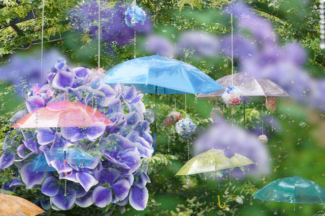 園内の紫陽花とカサのオブジェを多重露光で重ねてみました。