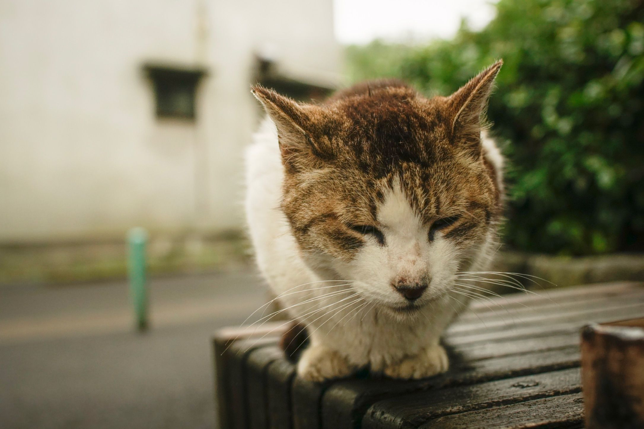 小雨が降りしきる中、ベンチに座っているねこと出会って撮りました