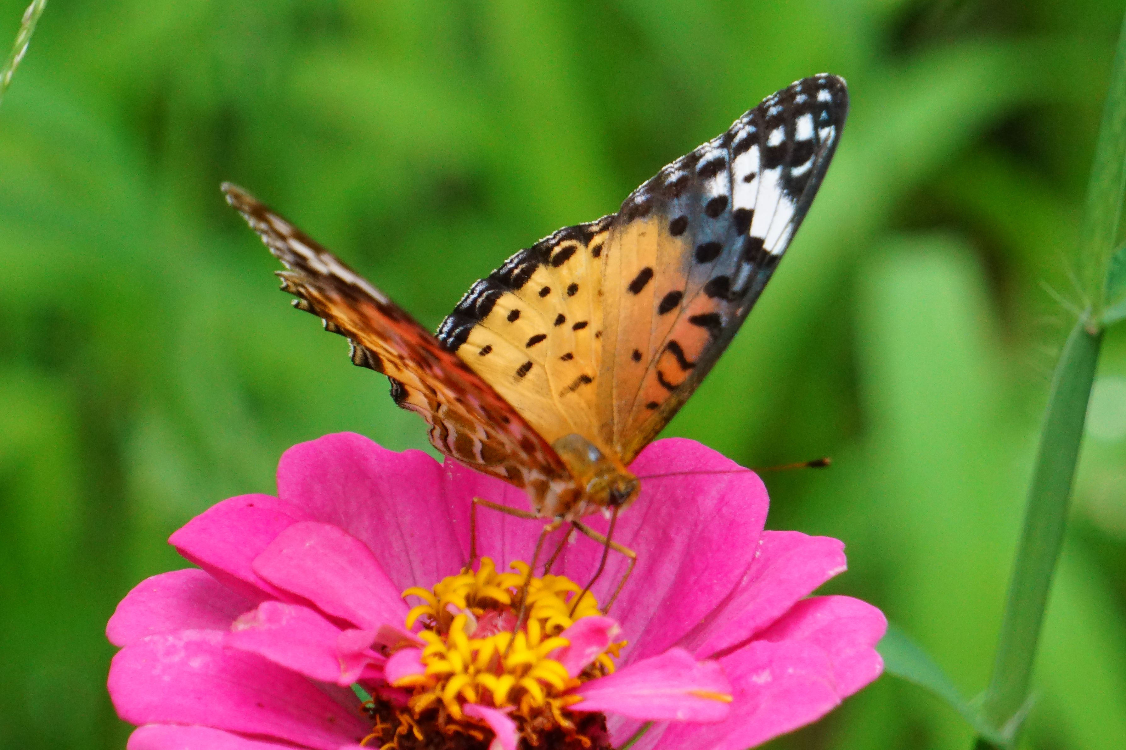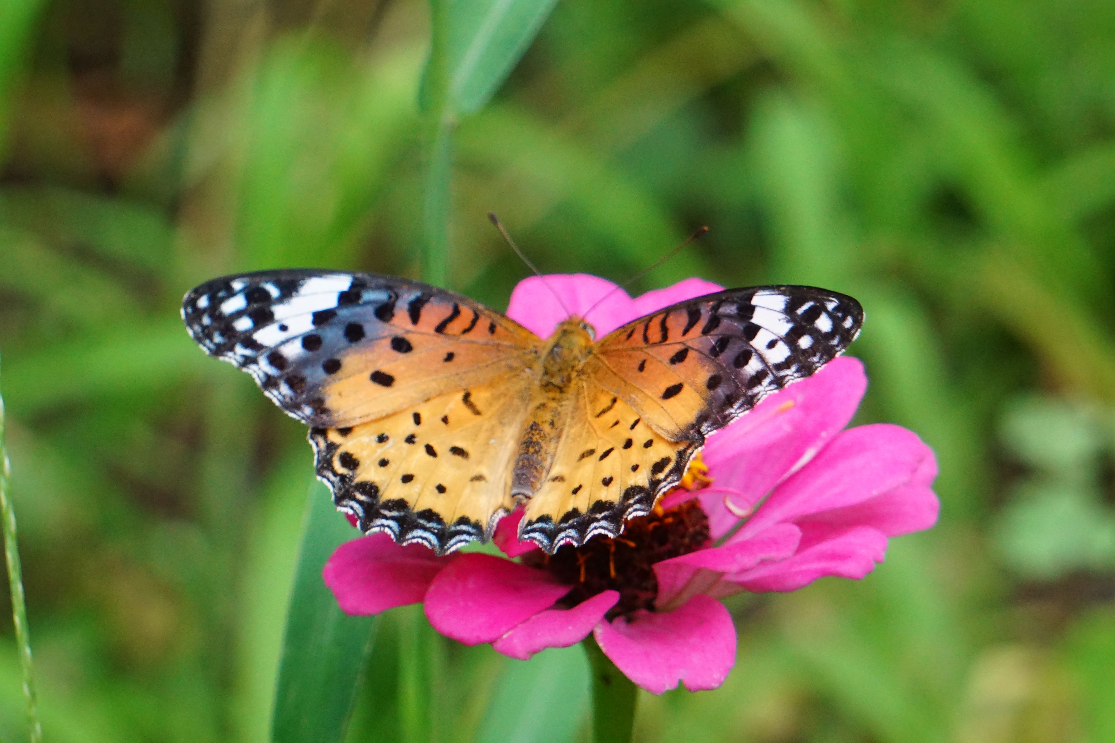 ツマグロヒョウモン♀が庭の百日草に魅かれてやってきます。