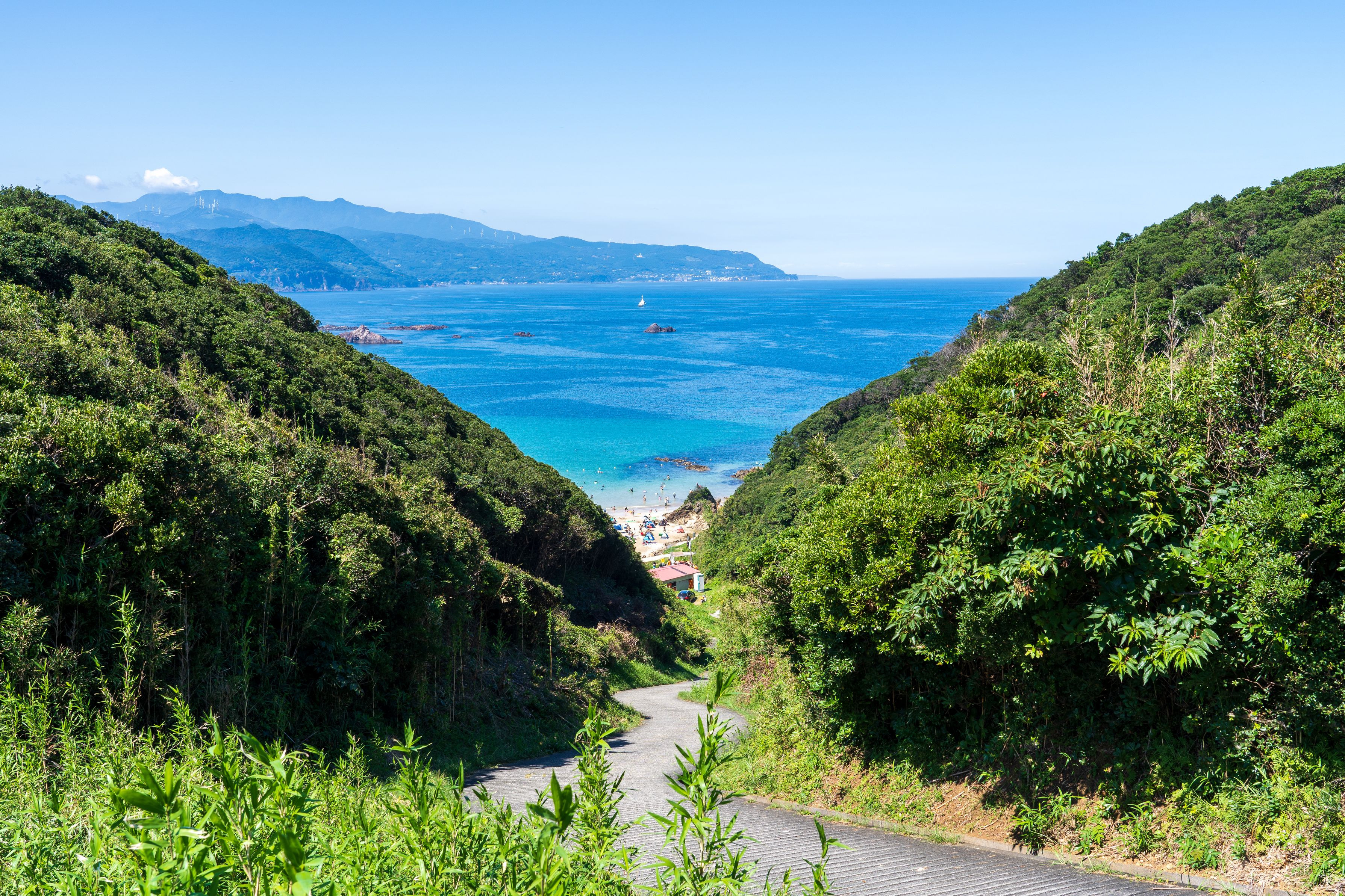 激坂を徒歩で下ると広がる綺麗な海岸(下田 九十浜) すぐ隣には須崎御用邸が広がり、天皇陛下ご滞在のためか警察の方が暑い中、一生懸命警備をしていました。 そして帰りは当然の激坂登坂。荷物のスリム化の必要性を再確認。