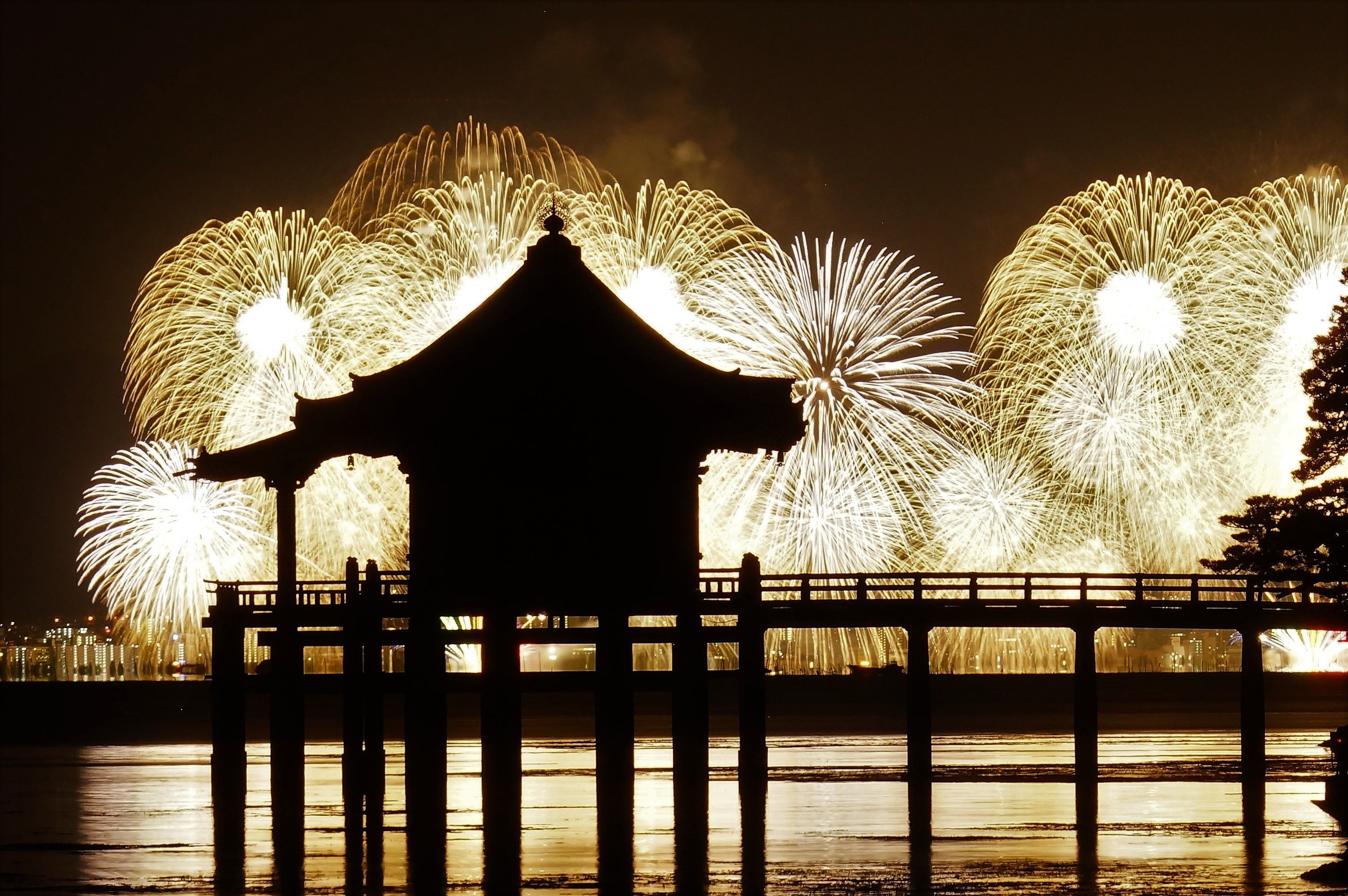 びわ湖花火大会の開催される浜大津から堅田の浮御堂まで直線距離で15km以上あるが、浮御堂を前景にびわ湖花火大会のフィナーレを撮りました。