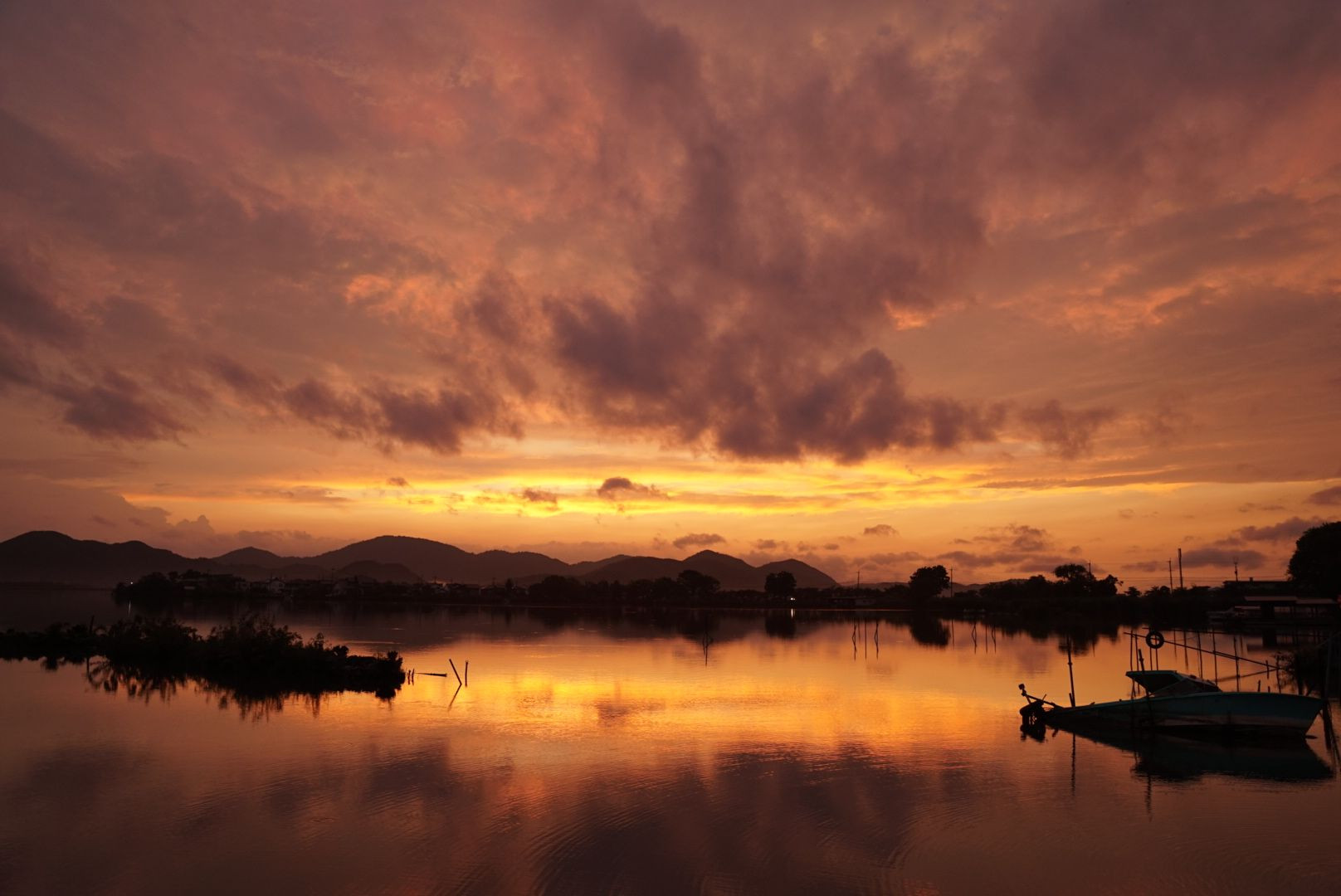 滋賀県は近江八幡市にある西の湖の夕景です。 波がない穏やかな湖面なので、 夕日がキレイに映えます。 沈みかけたあのボートも 夕景に佇み、いい役者になります。