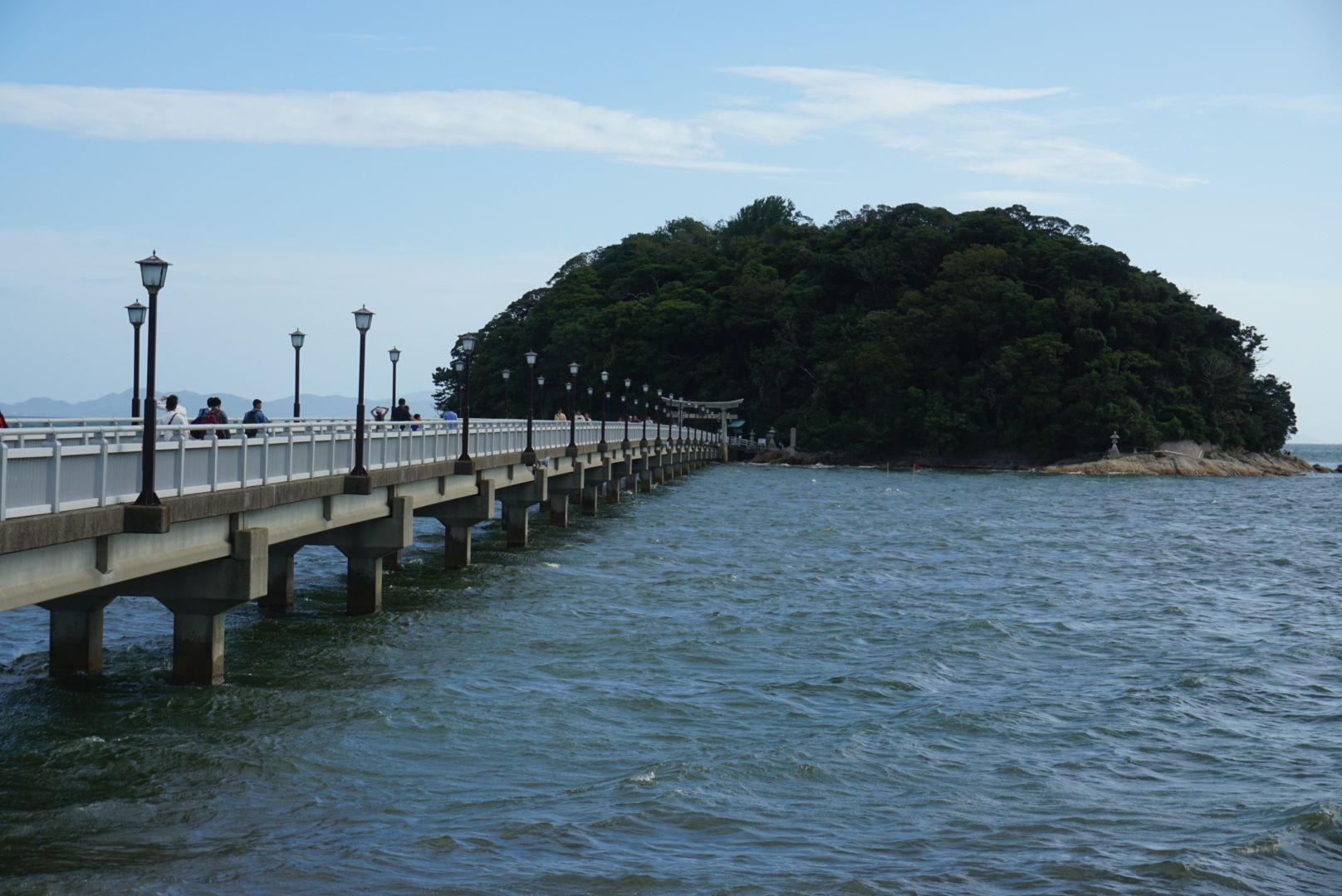 愛知県蒲郡市の竹島です。台風接近に伴い、風と波が荒れつつといった感じでした。島には神社があります。