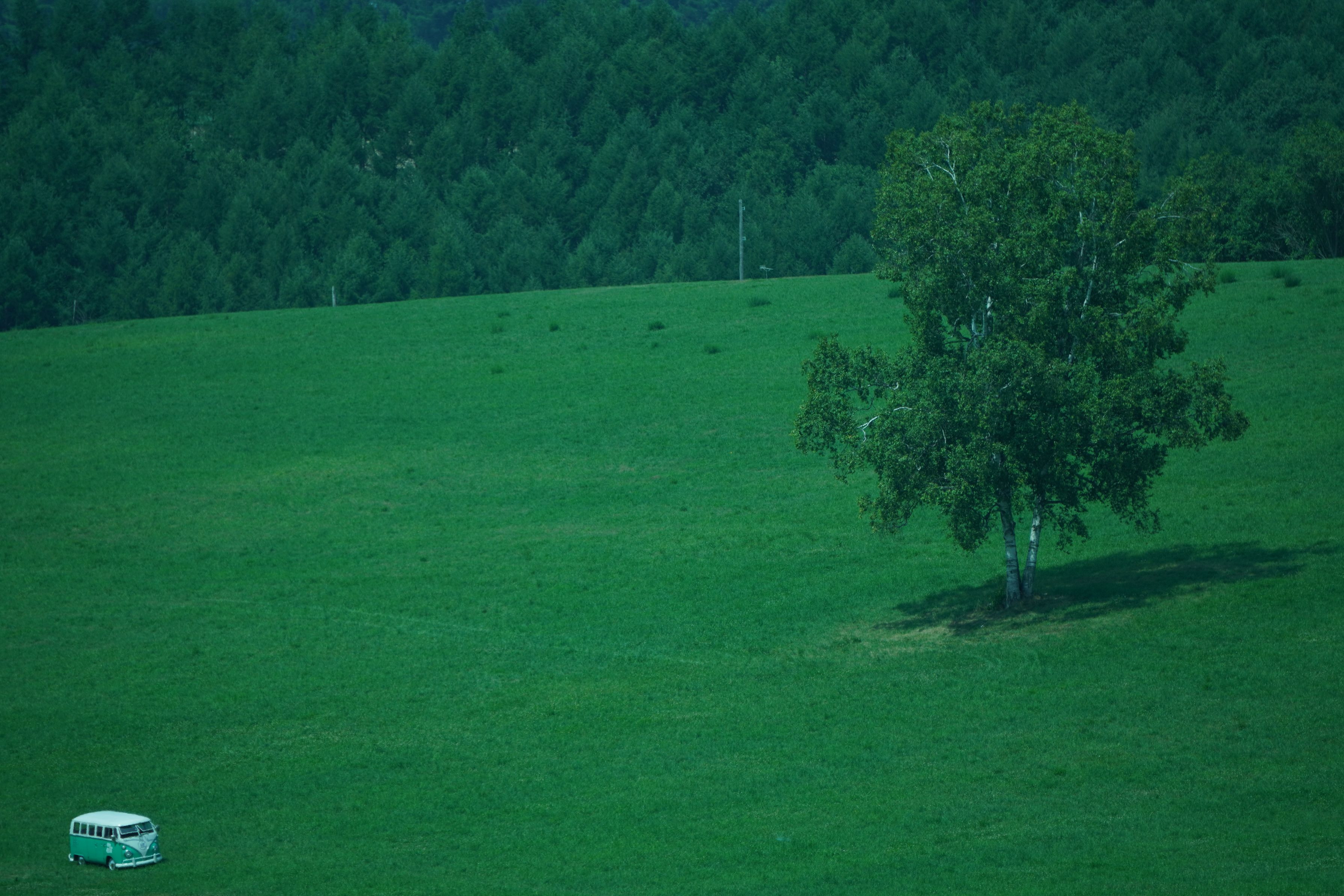 1枚目の写真は昨年夏に初めて訪れ撮影しました。丘の上にある一本の木が非常に印象的でした。2枚目の写真は今年撮影した写真です。VWバスがかわいいです。