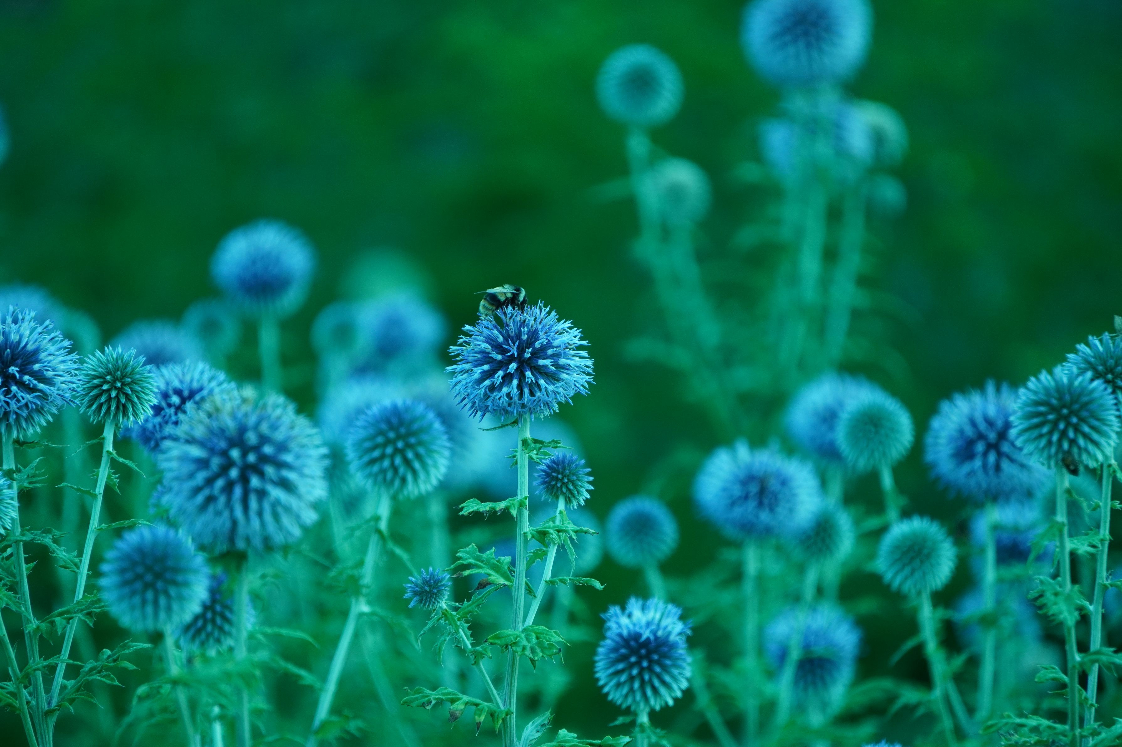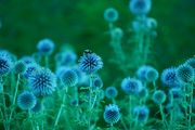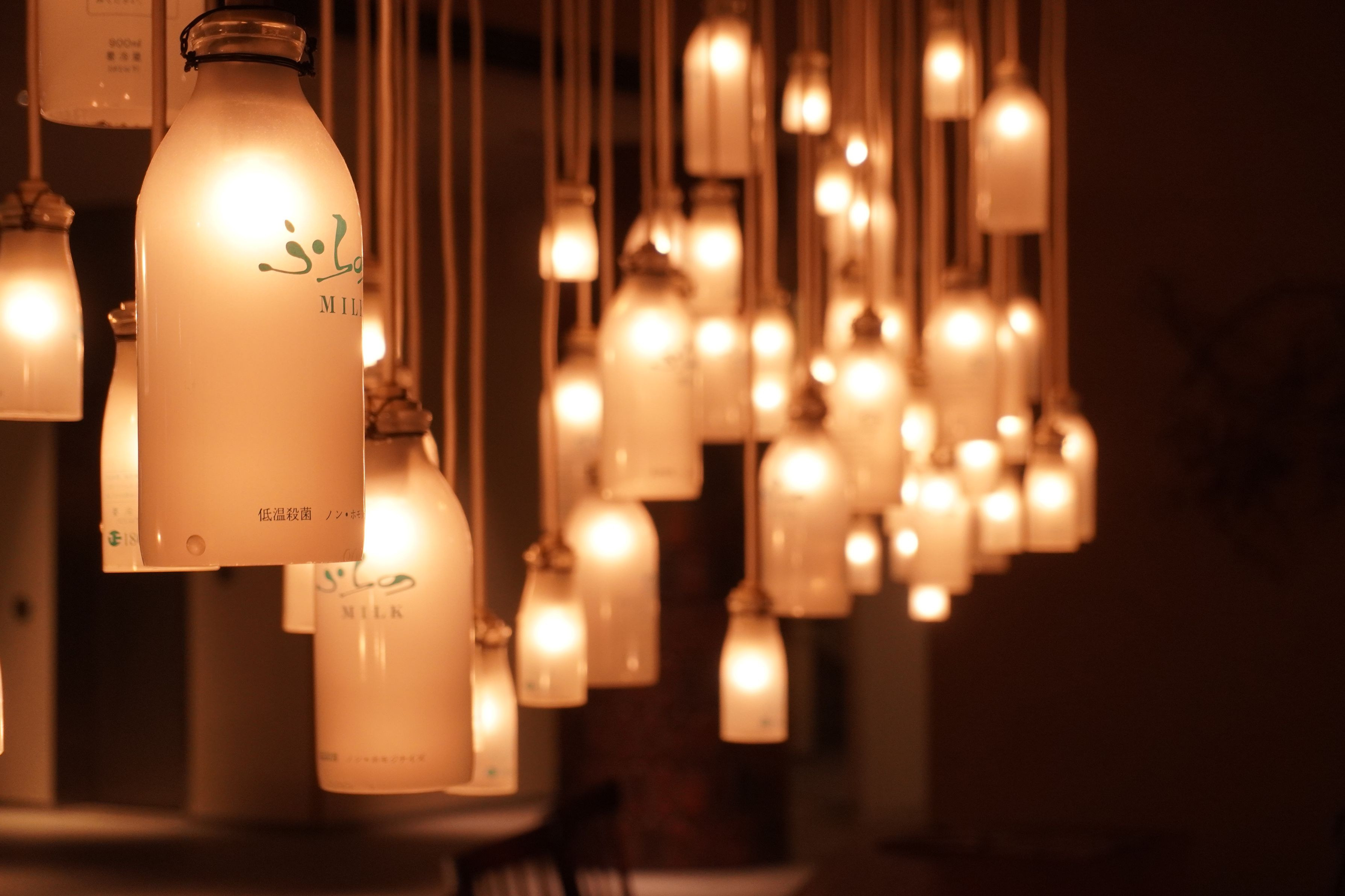 宿泊したホテルでの写真です。1枚目はルリマタアザミ?と思われる花とハチの写真です。2枚目はホテルのロビーで牛乳瓶を利用した電球💡です。あったかい光がきれいでした。