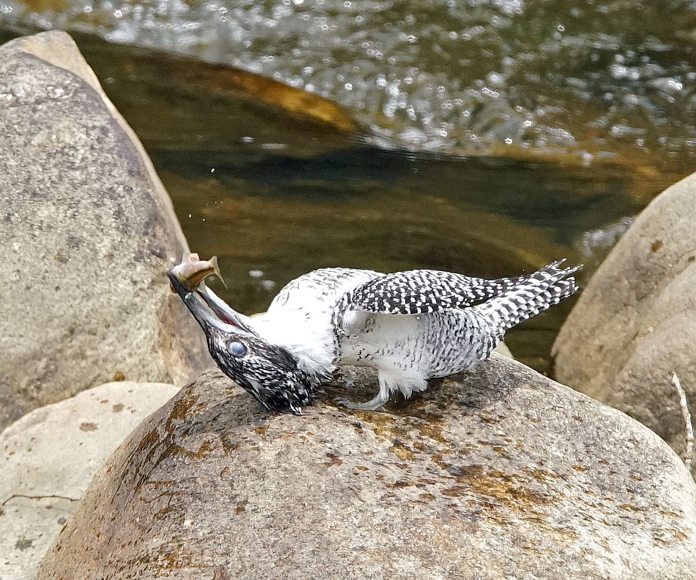 魚を捕獲したヤマセミが魚の息の根を止めようと 瞬幕を閉じ首を回転した。