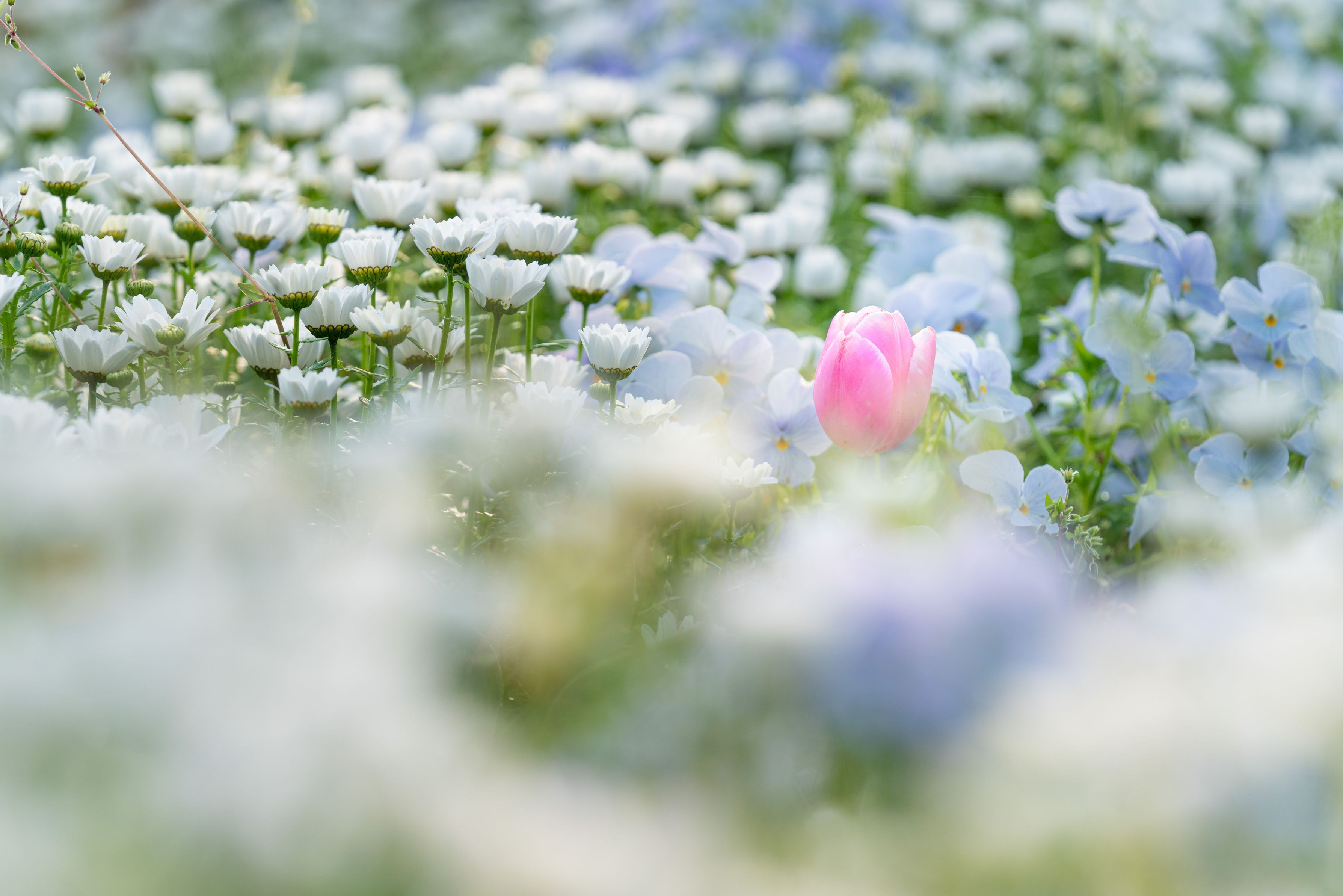 ピンクのチューリップと周りの花々が素敵な雰囲気を作っていました。