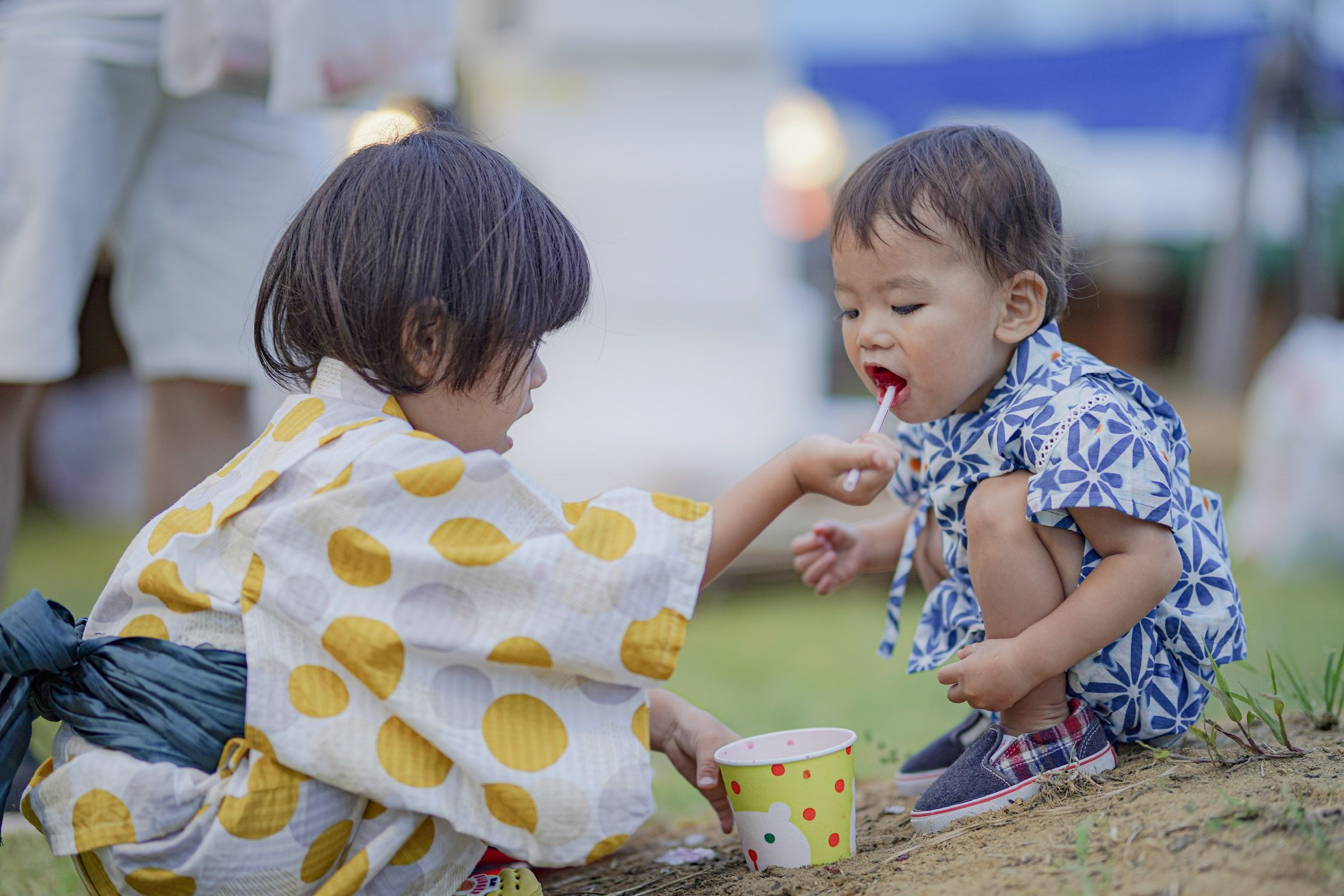 お姉ちゃんがかき氷を弟にあーんしてあげている所を撮りました。 お姉ちゃんまで口が開いている所が可愛らしく思います。