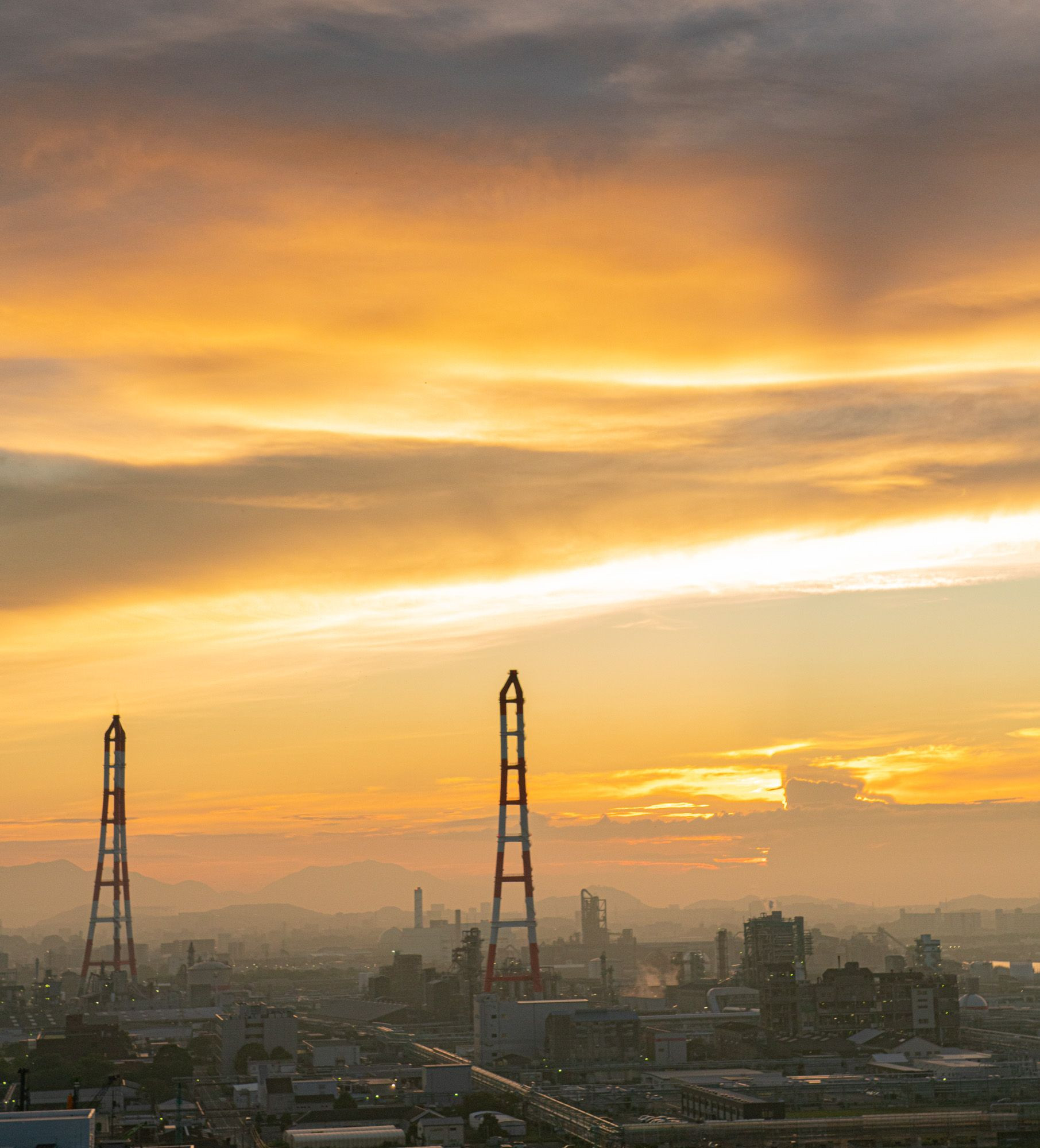 ここは北九州市の有名な工場夜景スポット、城山(黒崎城址)です。近くを通っていたら夕日がきれいだったので急きょ現地へ。この日は黄金色に焼けました。ちょっと霞んでいましたが、それもいい味になりました。