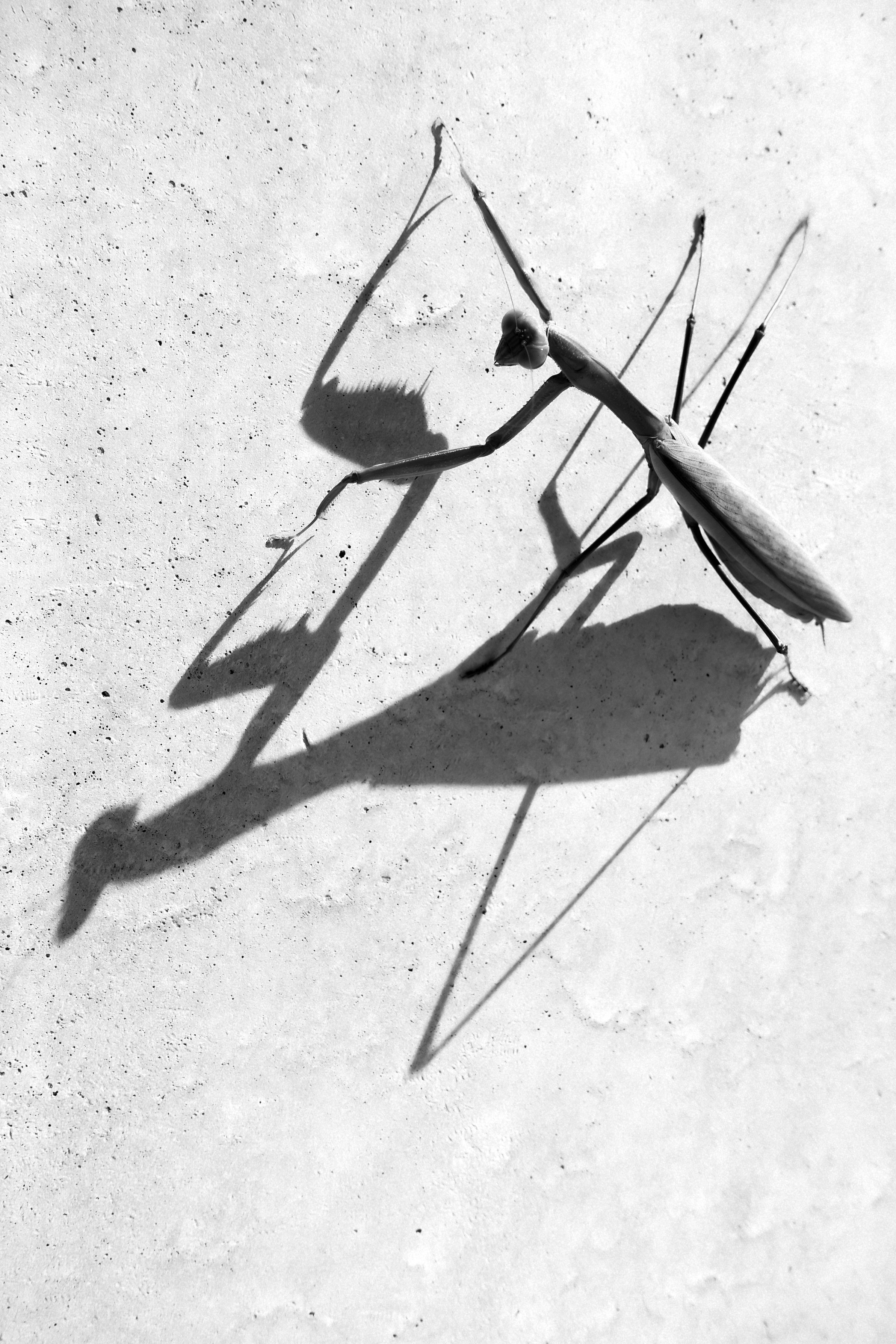 手を取り合って影とダンシング。コンクリートの壁にいたカマキリです。