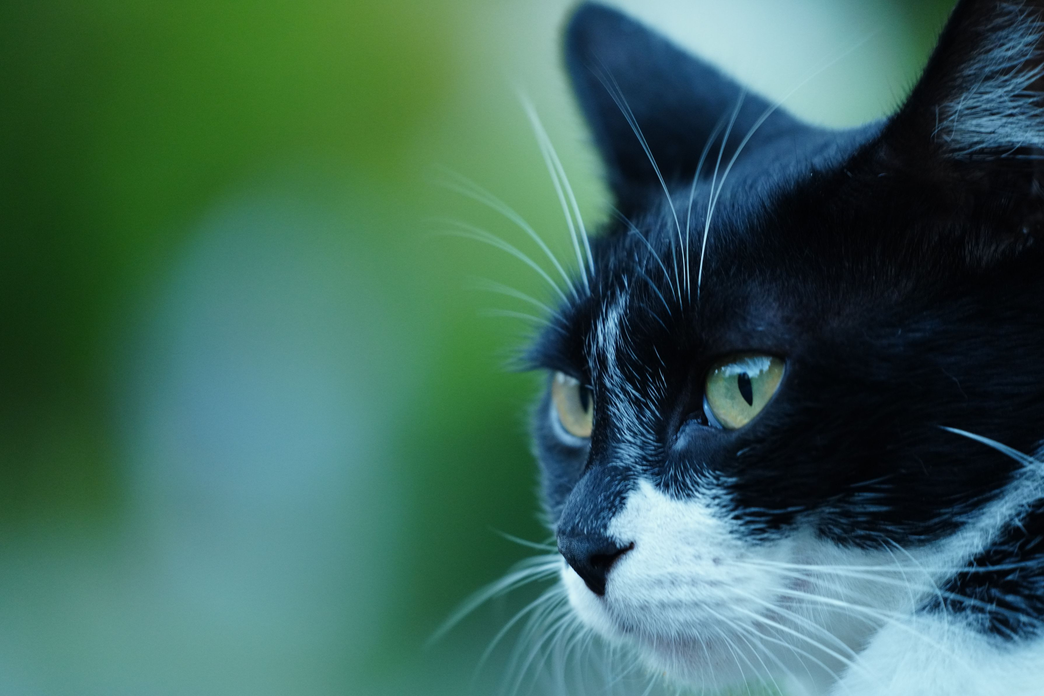 散歩の途中、何かを狙うように見つめる猫を発見。 瞳フォーカスが効いたのか!? 鋭い目つきが撮れました!!