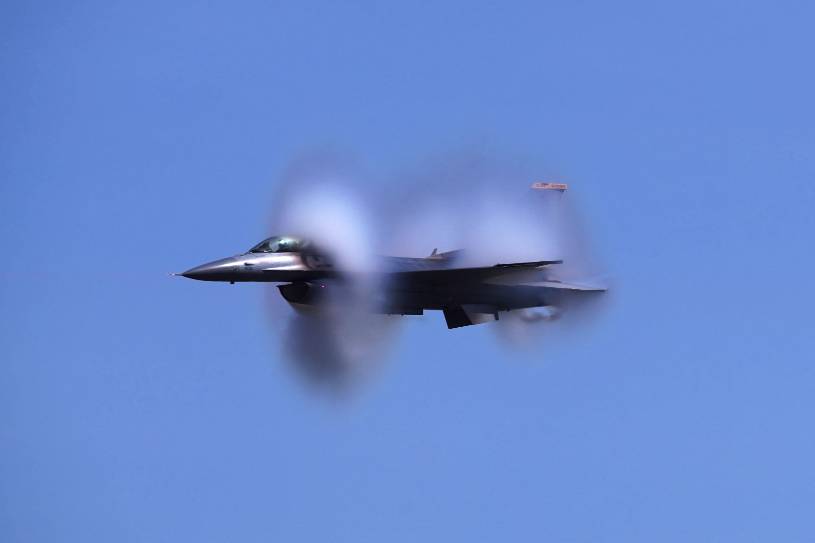 PACAF F16 viper demonstration team High Speed pass F-16の最高速度のたった半分と言われても、速すぎて追うのが精一杯。心が乱れてぶれてます。先に投稿の3連vapor coneの5コマ(8fps)前のカット。三沢基地上空にワープアウトしたプリモ氏操縦のF-16。 デスラー戦法か?(歳がばれる・・・) トリミング