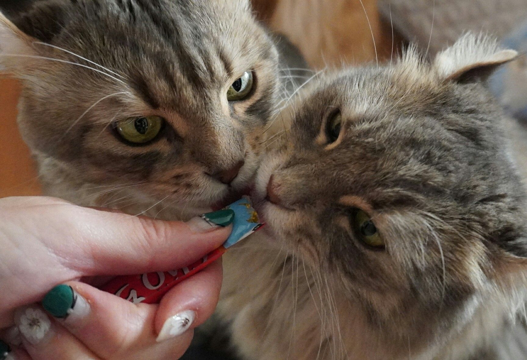 猫達は「ちゅーる」が皿に入るのを待ちきれず、直ナメしてしまいます。