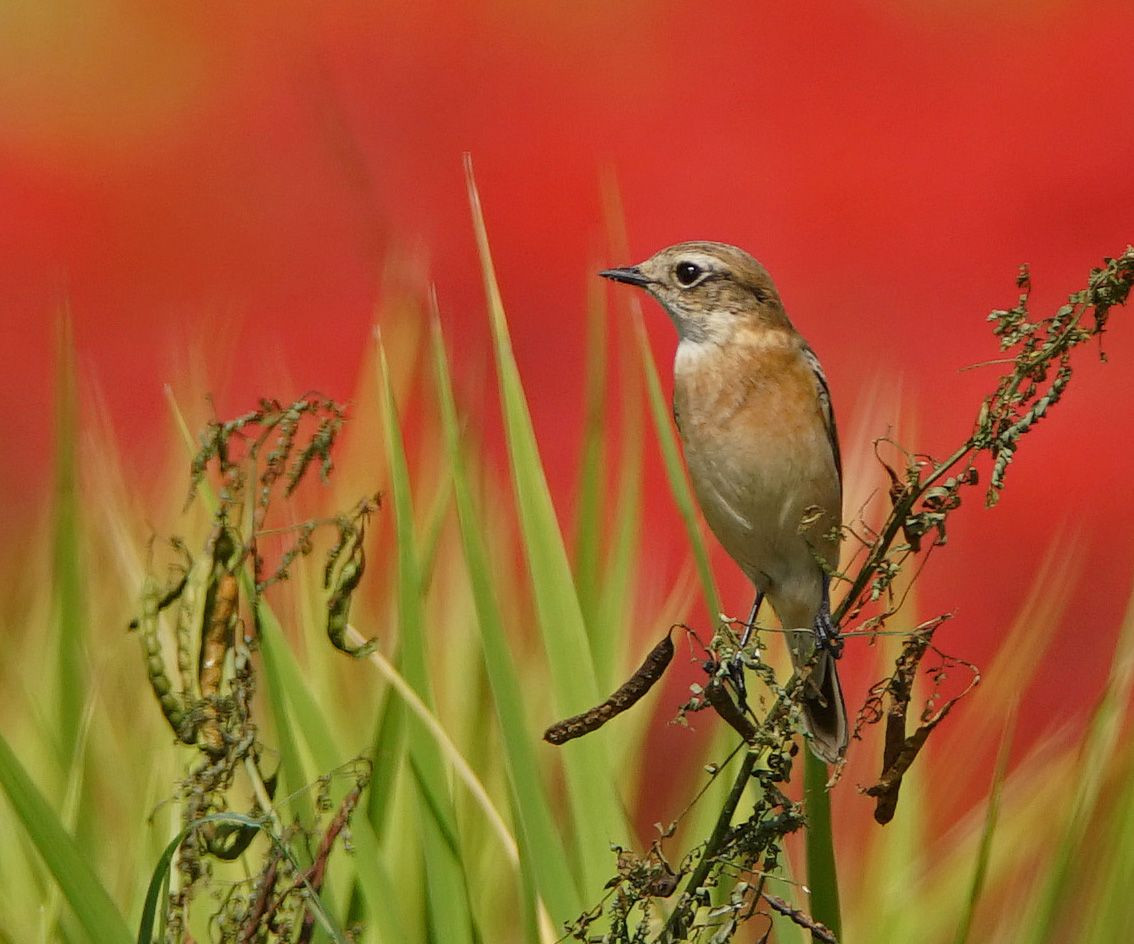 ノビタキが稲の葉先より少し高い雑草に止まった。