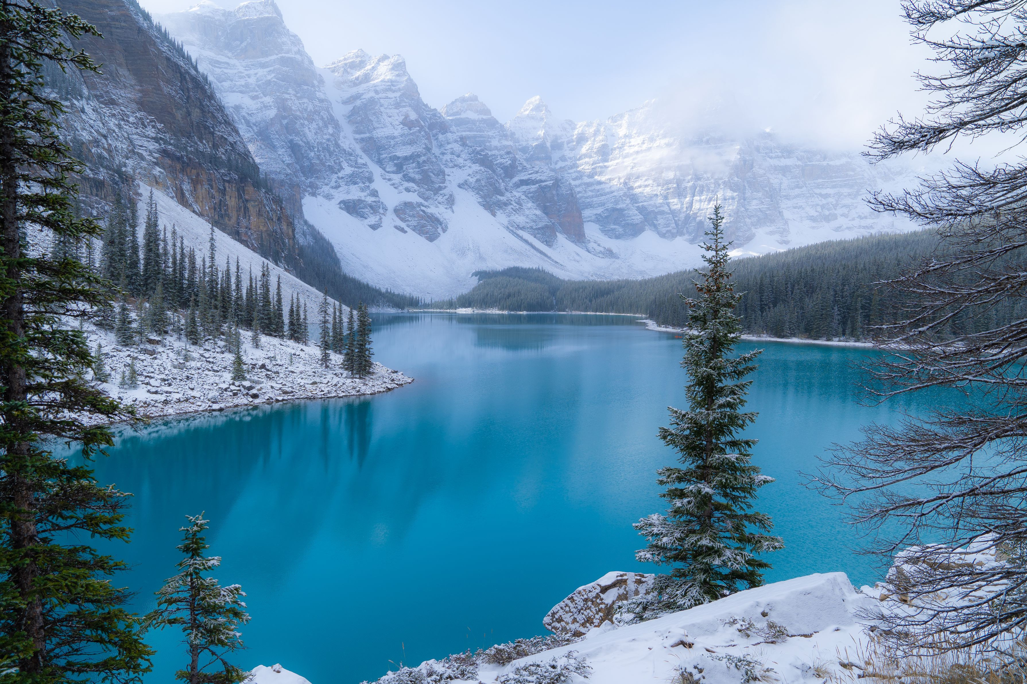 冬の間は閉鎖されてしまうモレーンレイク。訪問した直前に季節外れの猛吹雪があり、背後の山々に雪化粧をほどこした珍しい風景を楽しむことができました。