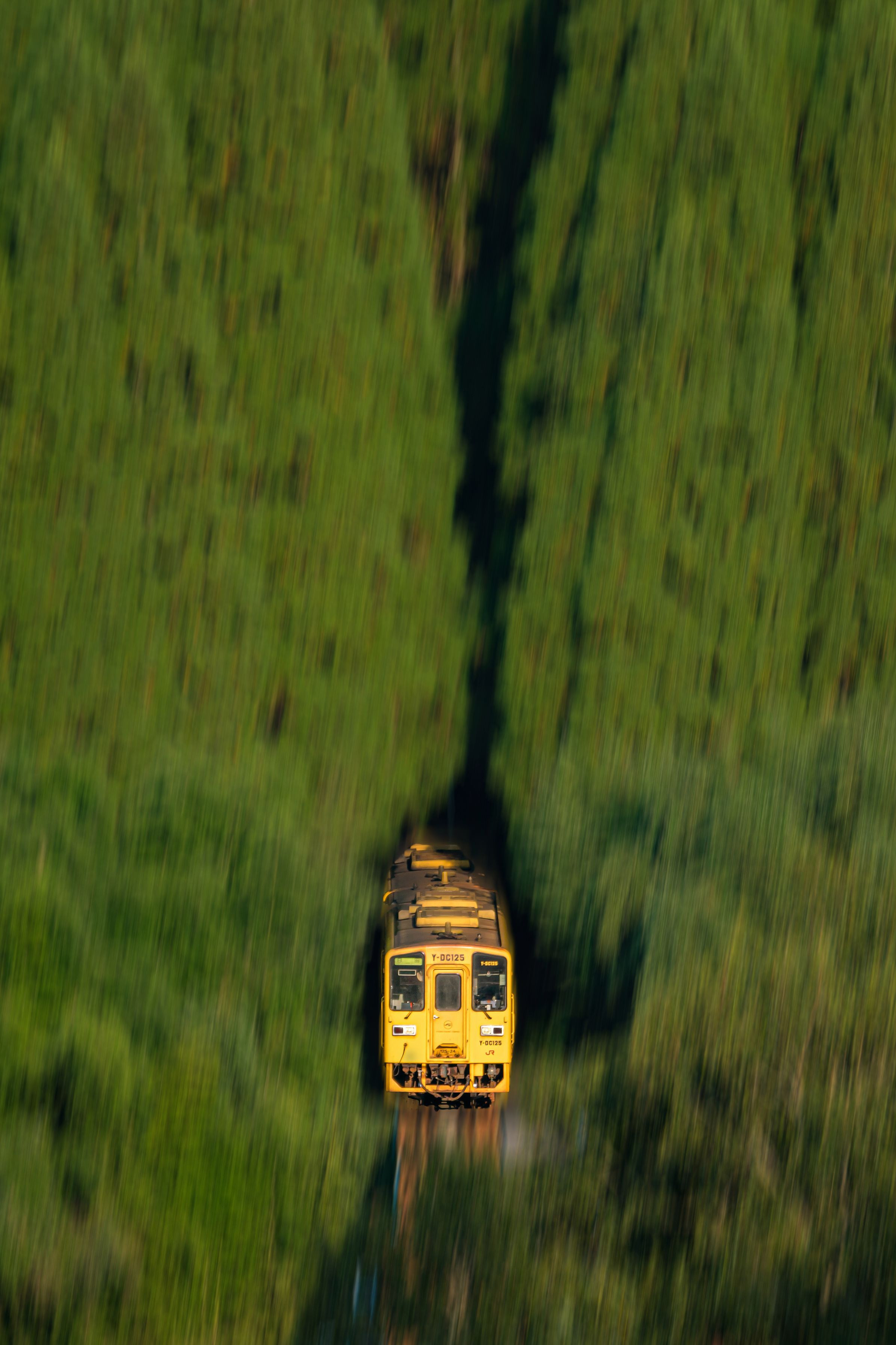トンネルから秋の夕陽に向かって走り出た。黄色と杉のコントラスト目を引いた。