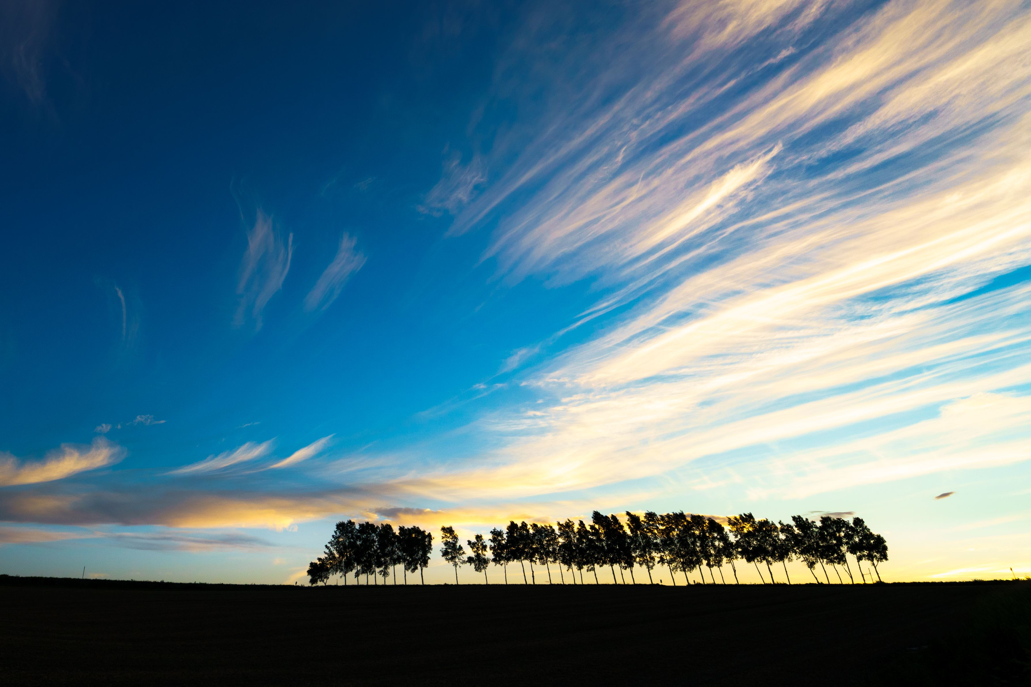 北海道・美瑛町にて。夜明けの風に吹かれて朝日に照らされた雲が流されて行きました。