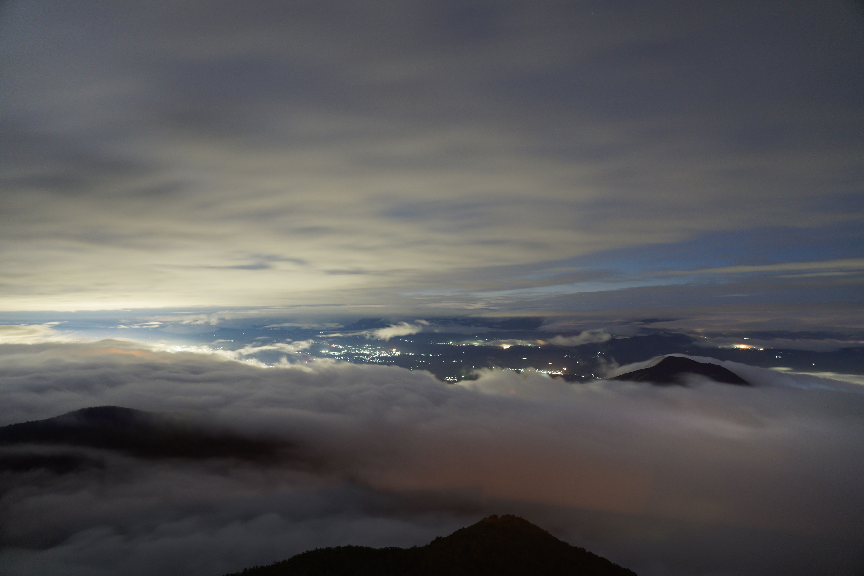 長野県の竜王マウンテンパークまで雲海に会いたくて出かけました。 初日雲海どころか1M先も見えづらいほどの霧の中…諦めて下山しました。2日目もあきらめムードで志賀高原の秋色探しをしていると、現地のライブカメラに雲海が…!慌てて向かって、ギリギリ間に合いました。下界には街灯りが広がりとてもキレでした。