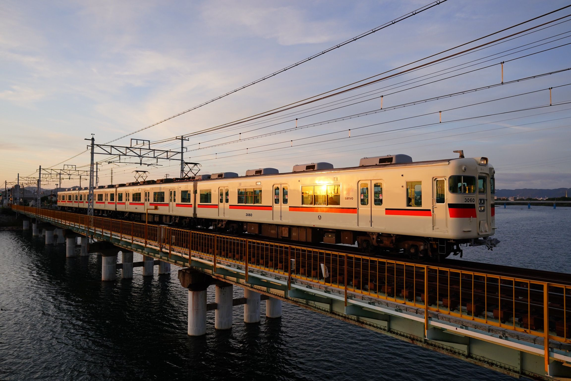 今日は日没ギリギリまで太陽を見ることができました。 明るい色の車体に沈みゆく太陽がギラリします。 #山陽電気鉄道#
