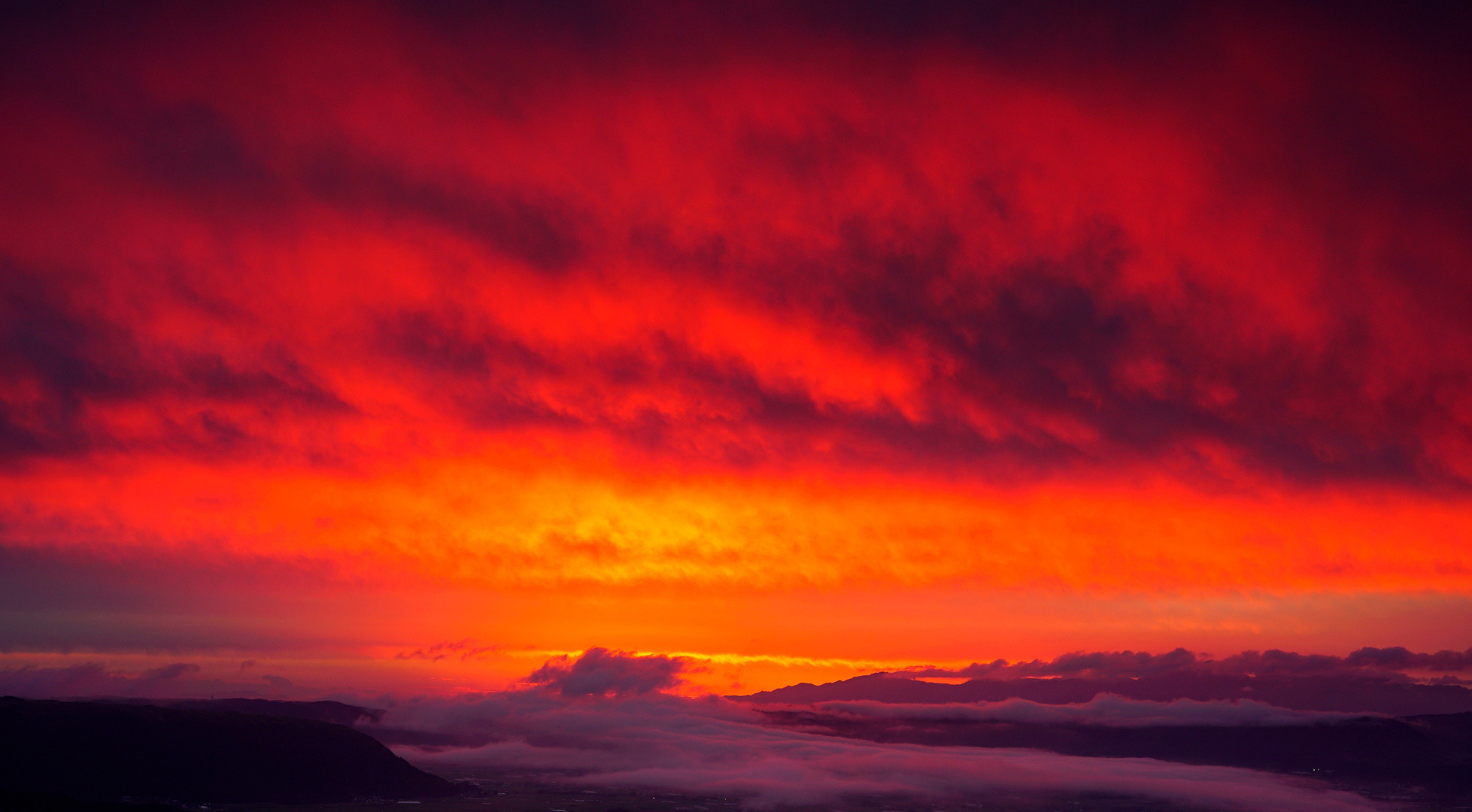 雲海とご来光を狙って阿蘇外輪山に行きました。 両方とも不発でしたが、真っ赤な朝焼けに出会いました。 熊本県阿蘇外輪山より