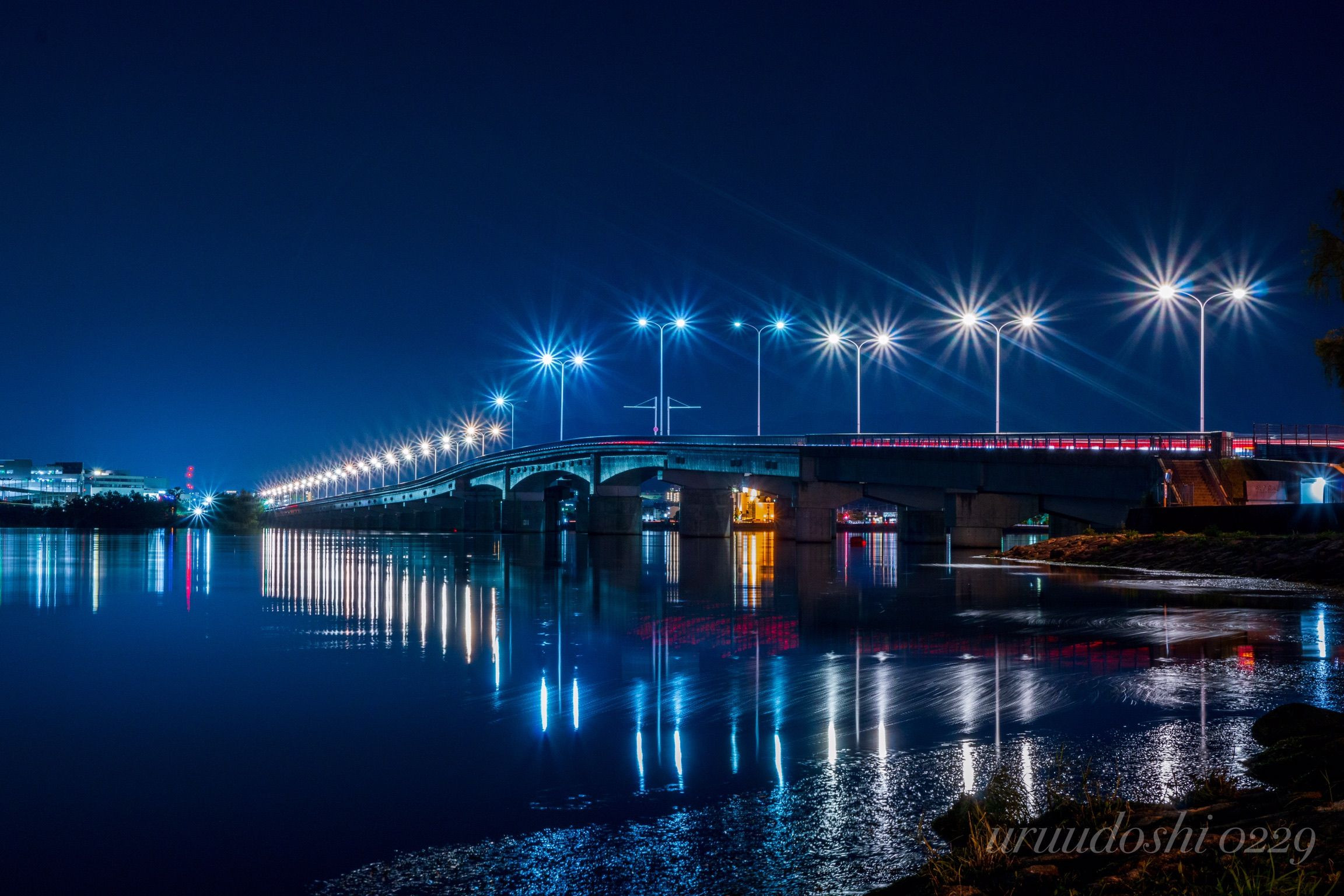 少しでも風が吹くと波立つ琵琶湖面。 夜間は比較的波が穏やかになり、無風状態だと波が目立たなくなる事も。 そんなタイミングで近江大橋の夜景を。