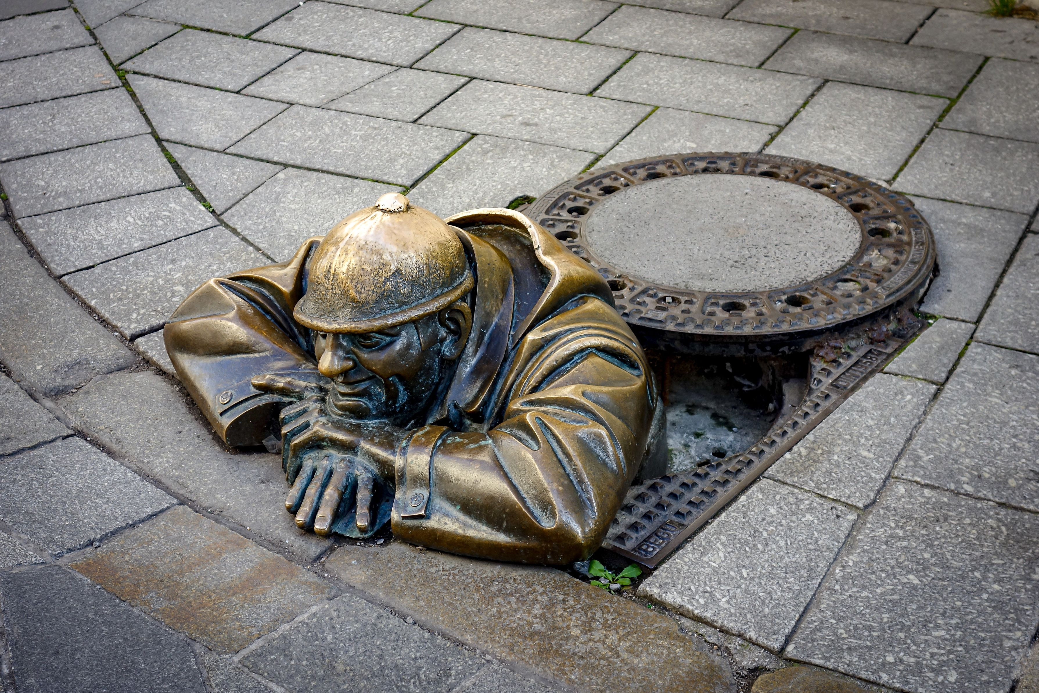 スロバキア・ブラチスラバにある一番人気なオブジェ! 「スカートの中を覗くマンホールの男」 何故か?このマンホール男の頭をさするとお金が貯まるとの事で、 皆んなが頭をさする結果、頭の部分が光ってます。