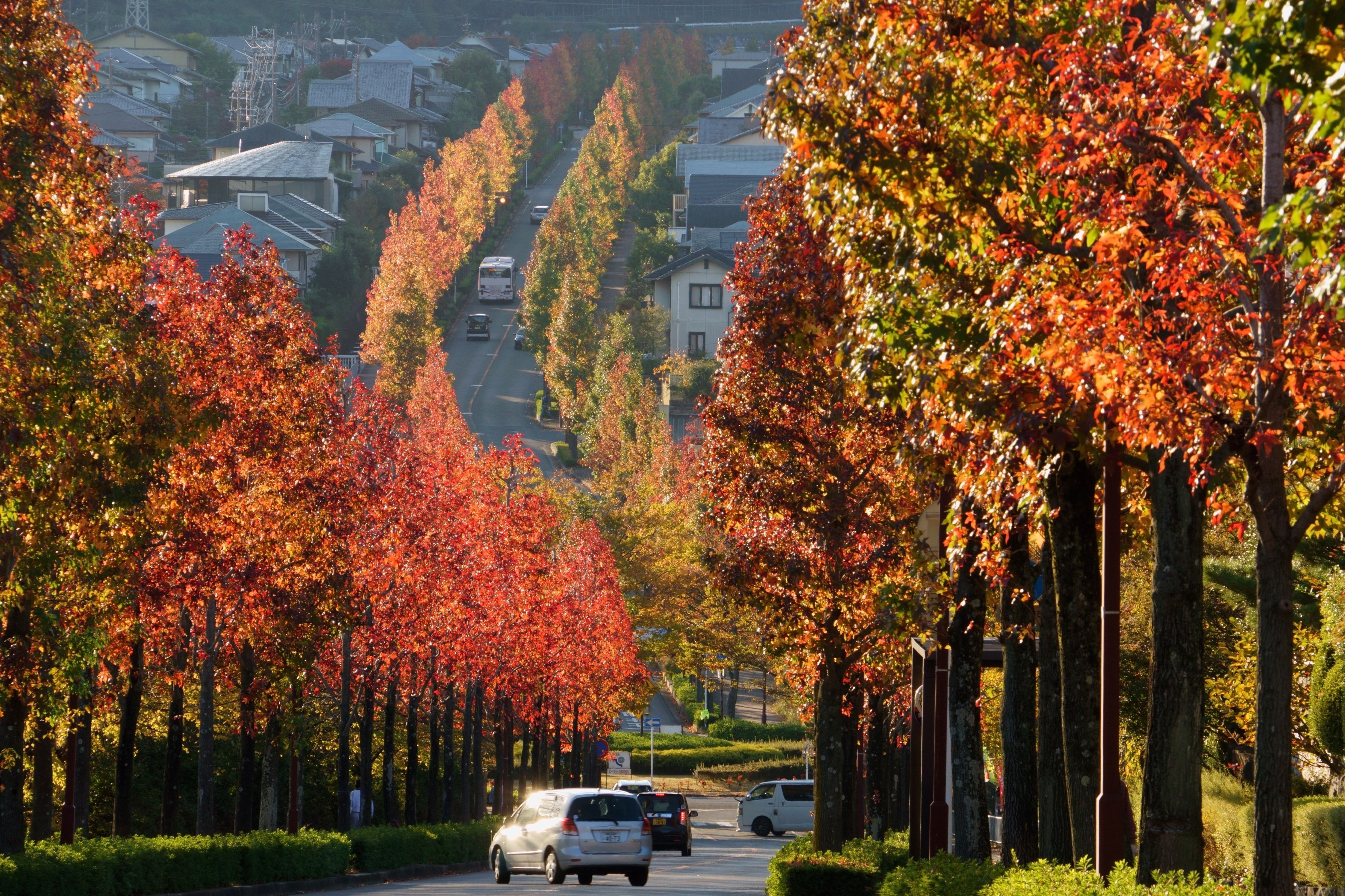 おそらく京都盆地の中で最も早く色づく桂坂のモミジバフウ並木 ほぼ東西に走るⅤ字形の坂道に半逆光の西日が当たると、現像加工なしでこの光景に