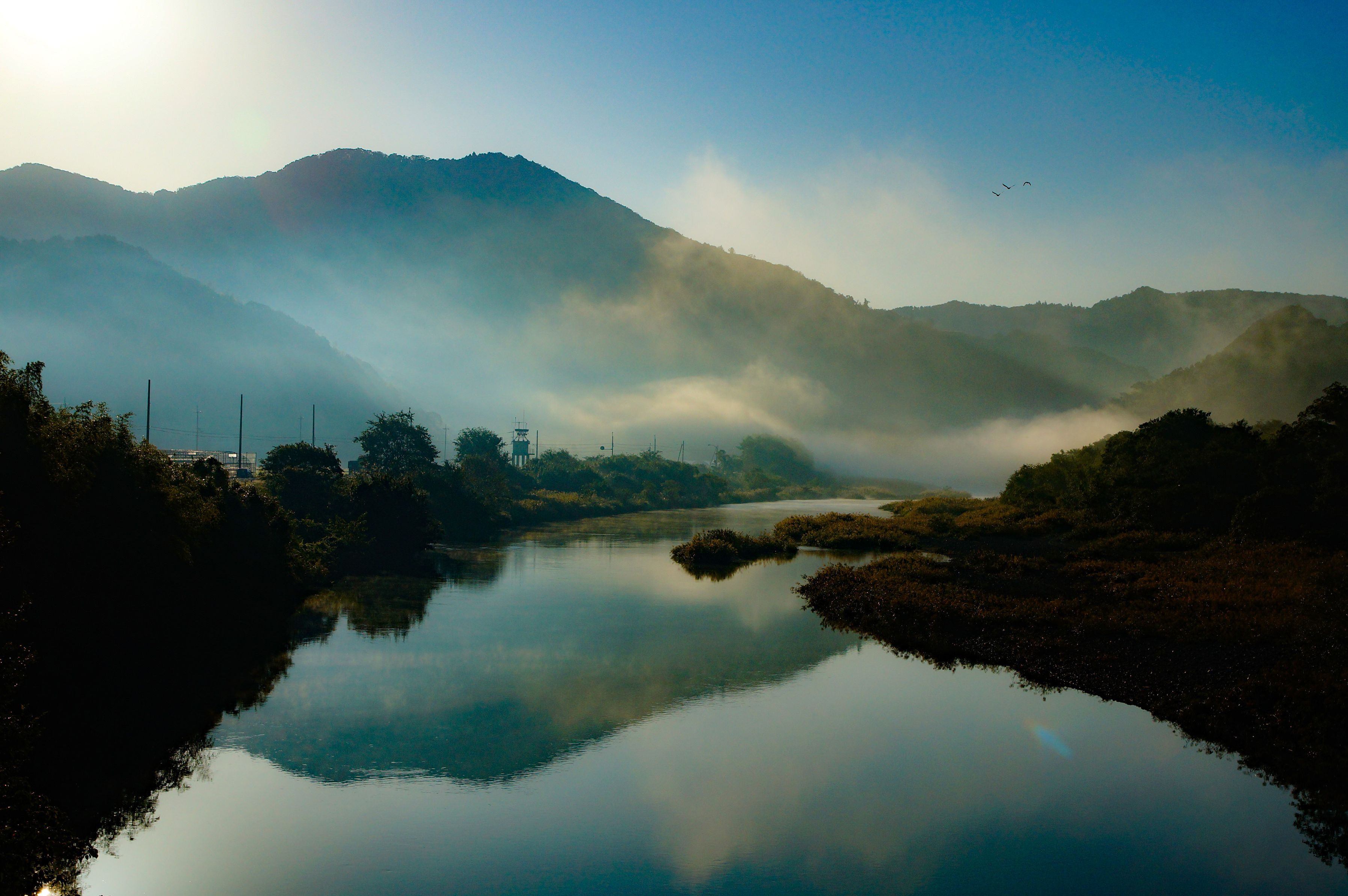 自宅近くの川はよく霧が出るので逆光で撮りました