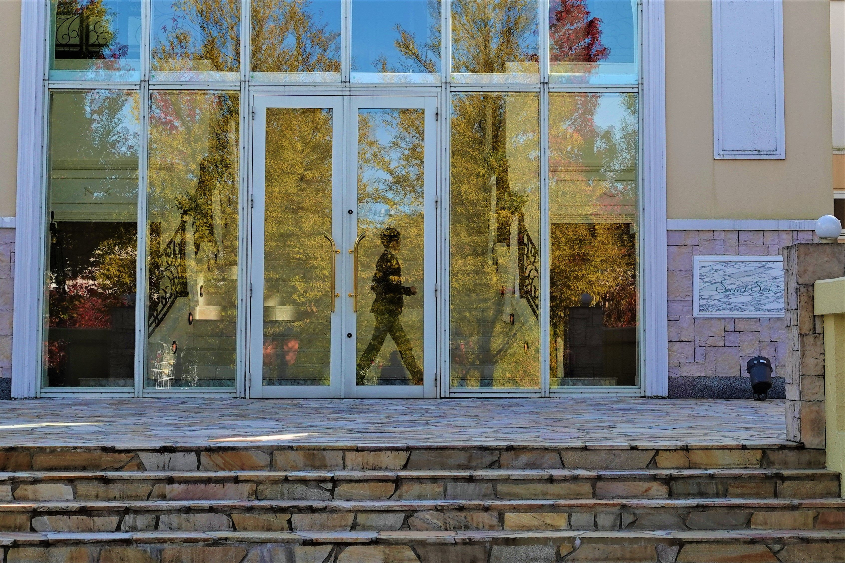 挙式場のガラスに映る、紅葉と従業員のスナップ