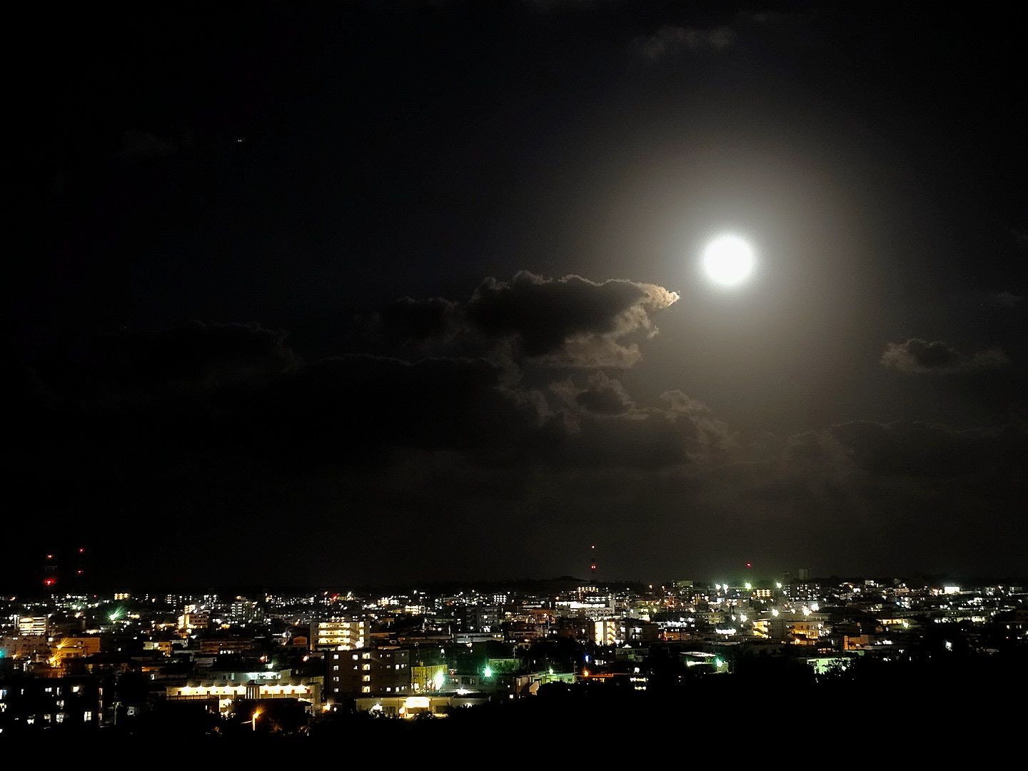 明るい満月をパシャリ。 キラキラと光る夜景に負けないステキな明かり。 もうちょい上手く撮りたいな。
