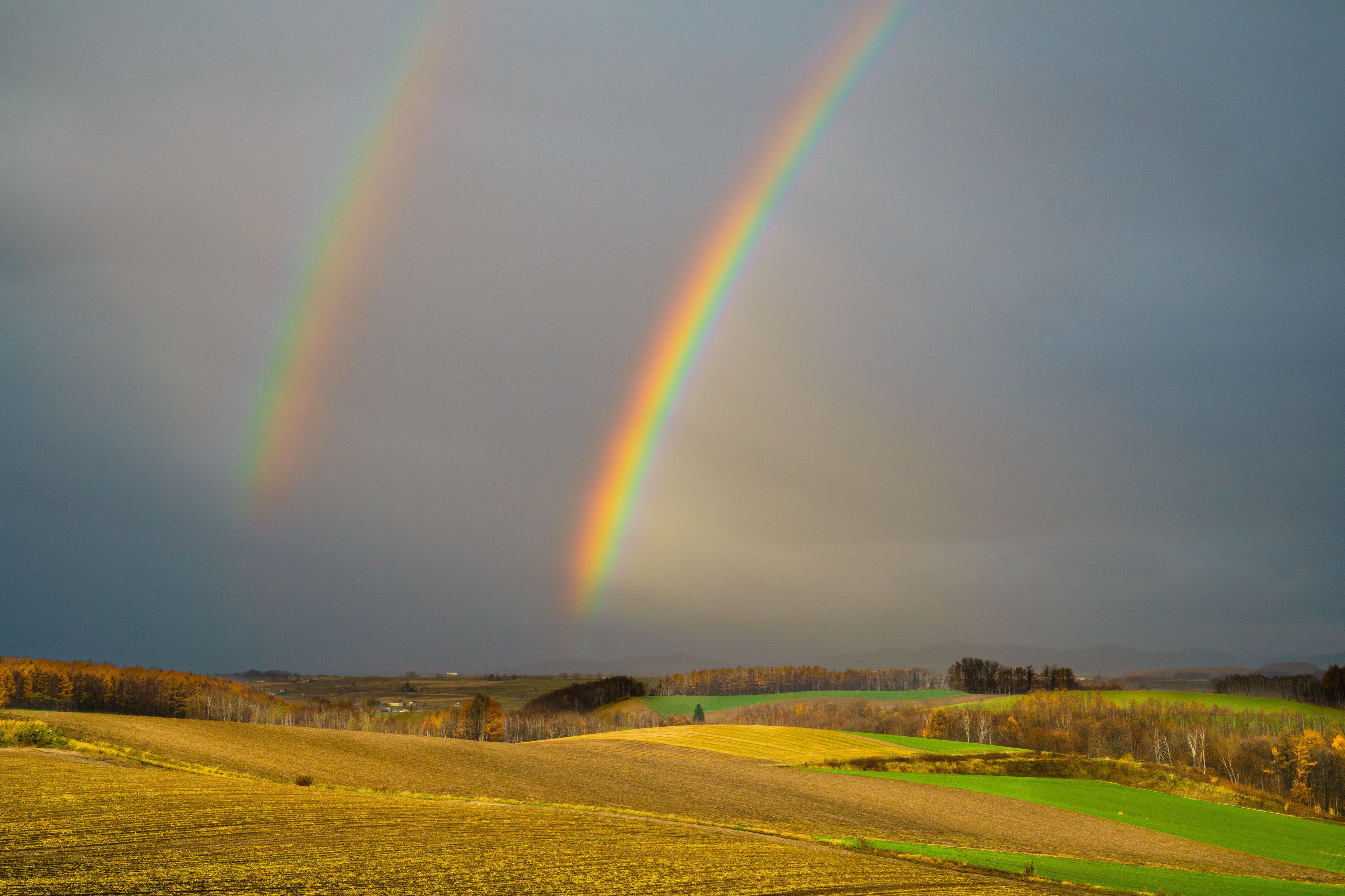 北海道・美瑛町にて。秋の空に壮大なダブルレインボーが架かりました。