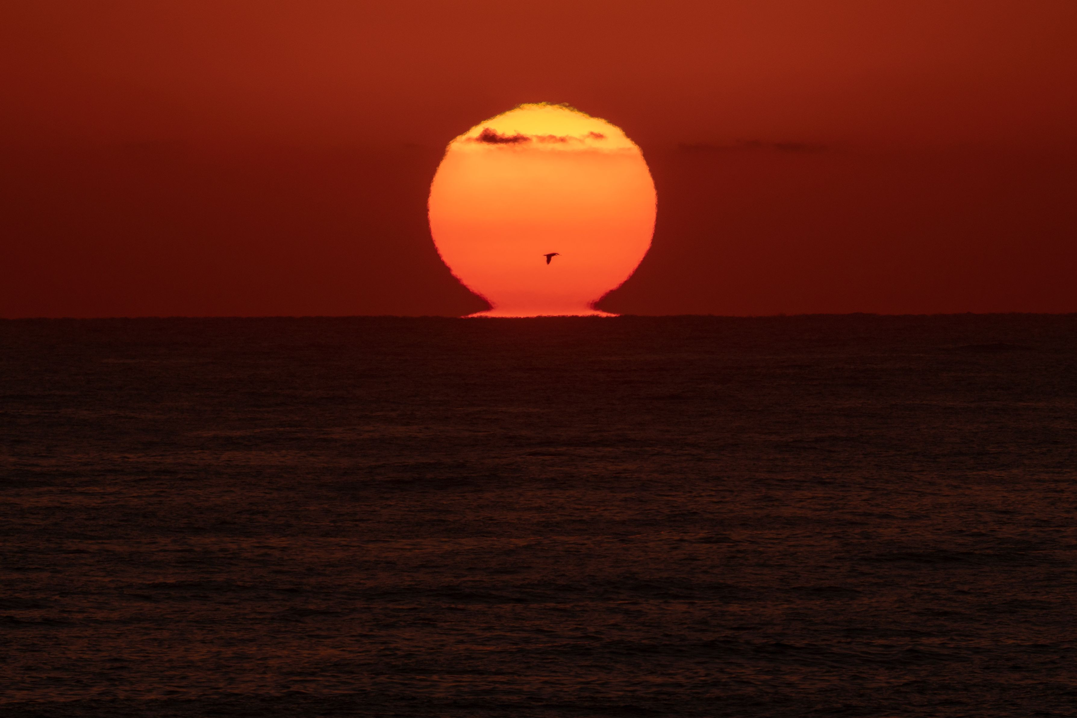 水平線の薄い雲がフィルターになってくれ、オレンジのダルマ朝陽になりました。
