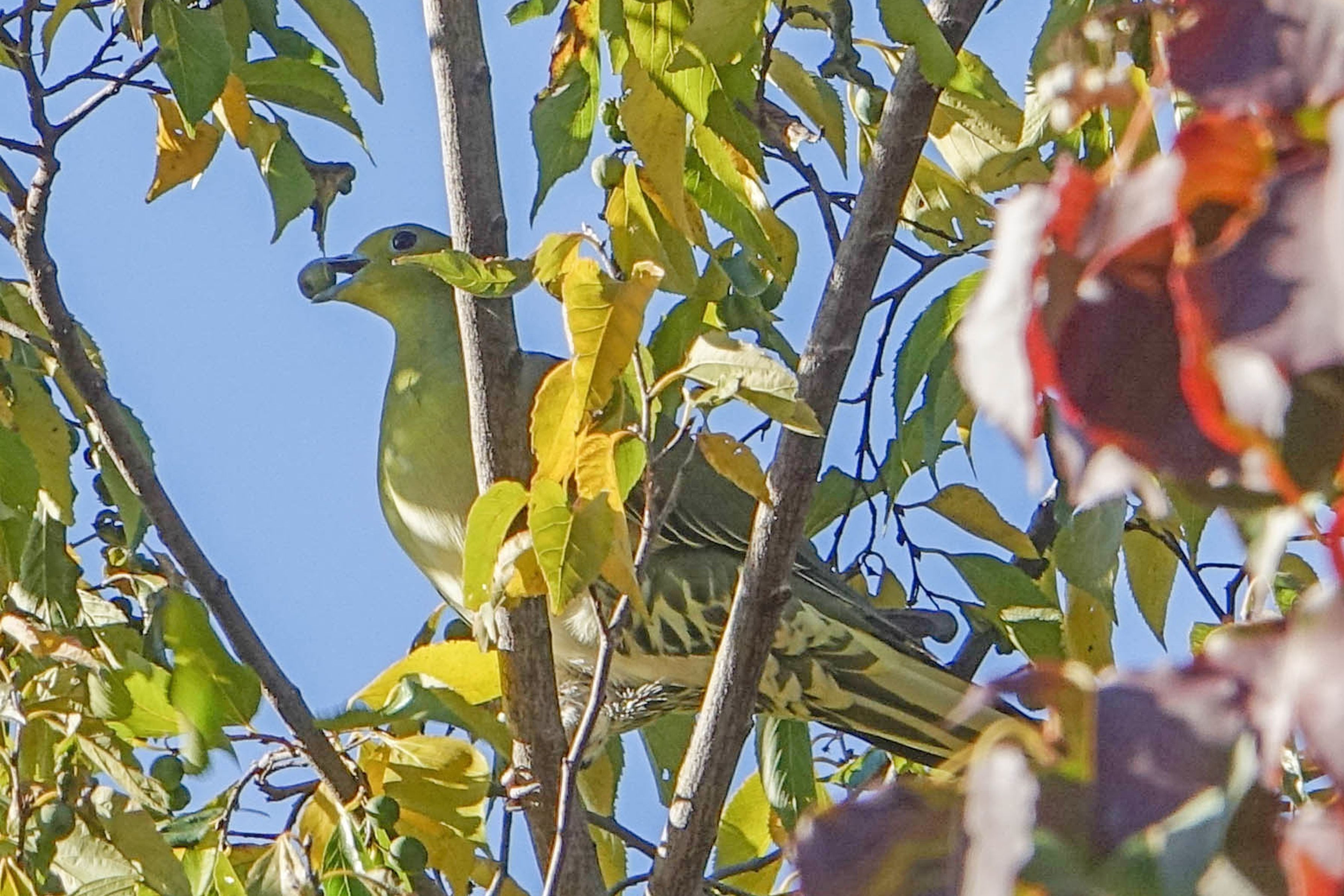アオバト♀。この時期は椋の実を食べています。