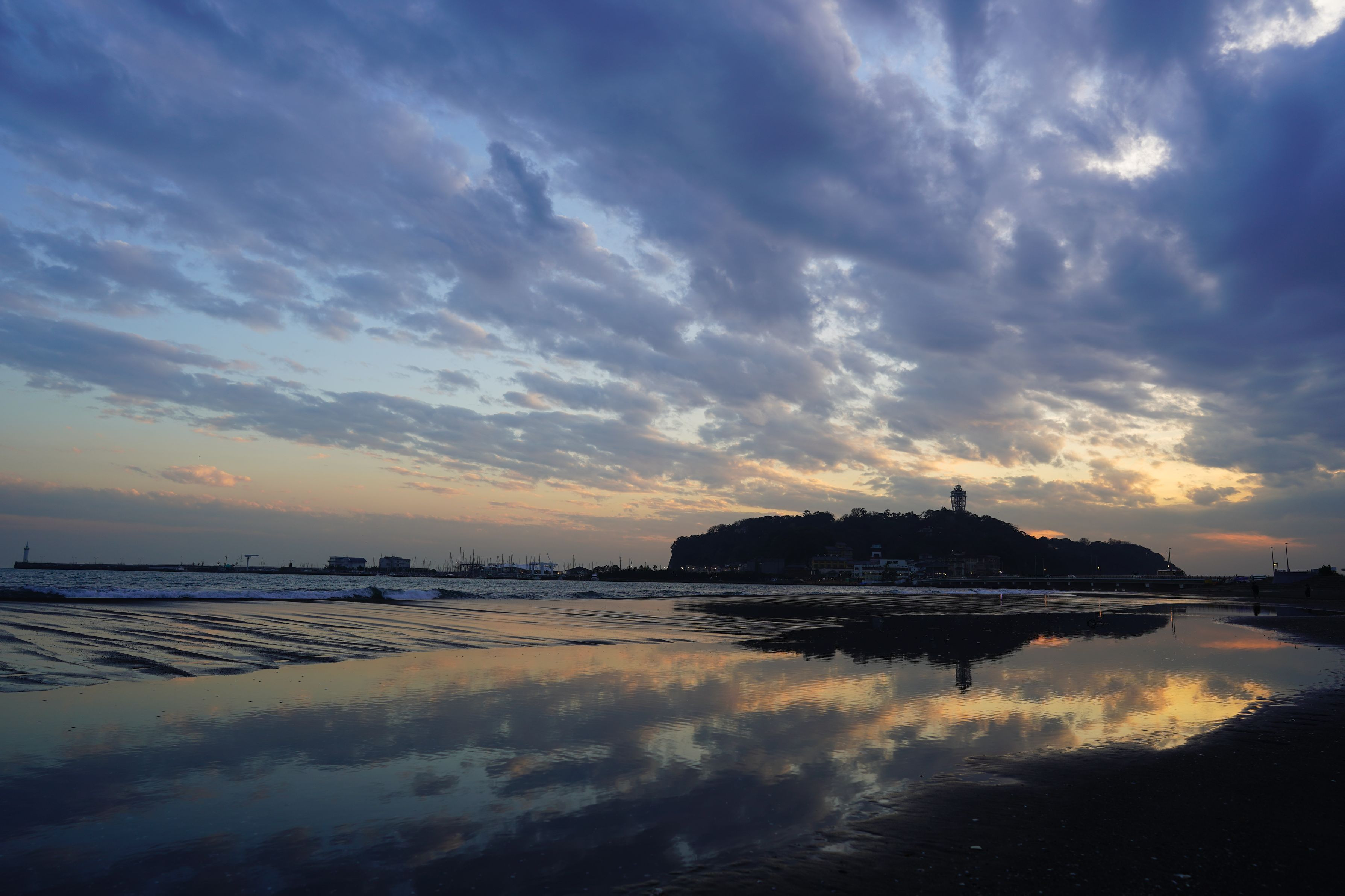 天気予報ではずっと曇り、もしくは雨の予報だったので夕暮れの撮影は諦めていました。 しかし、少し晴れ間が広がり、素敵な景色と巡り会うことができました。 ほぼ風が吹いている湘南なので、完全なリフレクションではないのですが、楽しんでいただければ幸いです。
