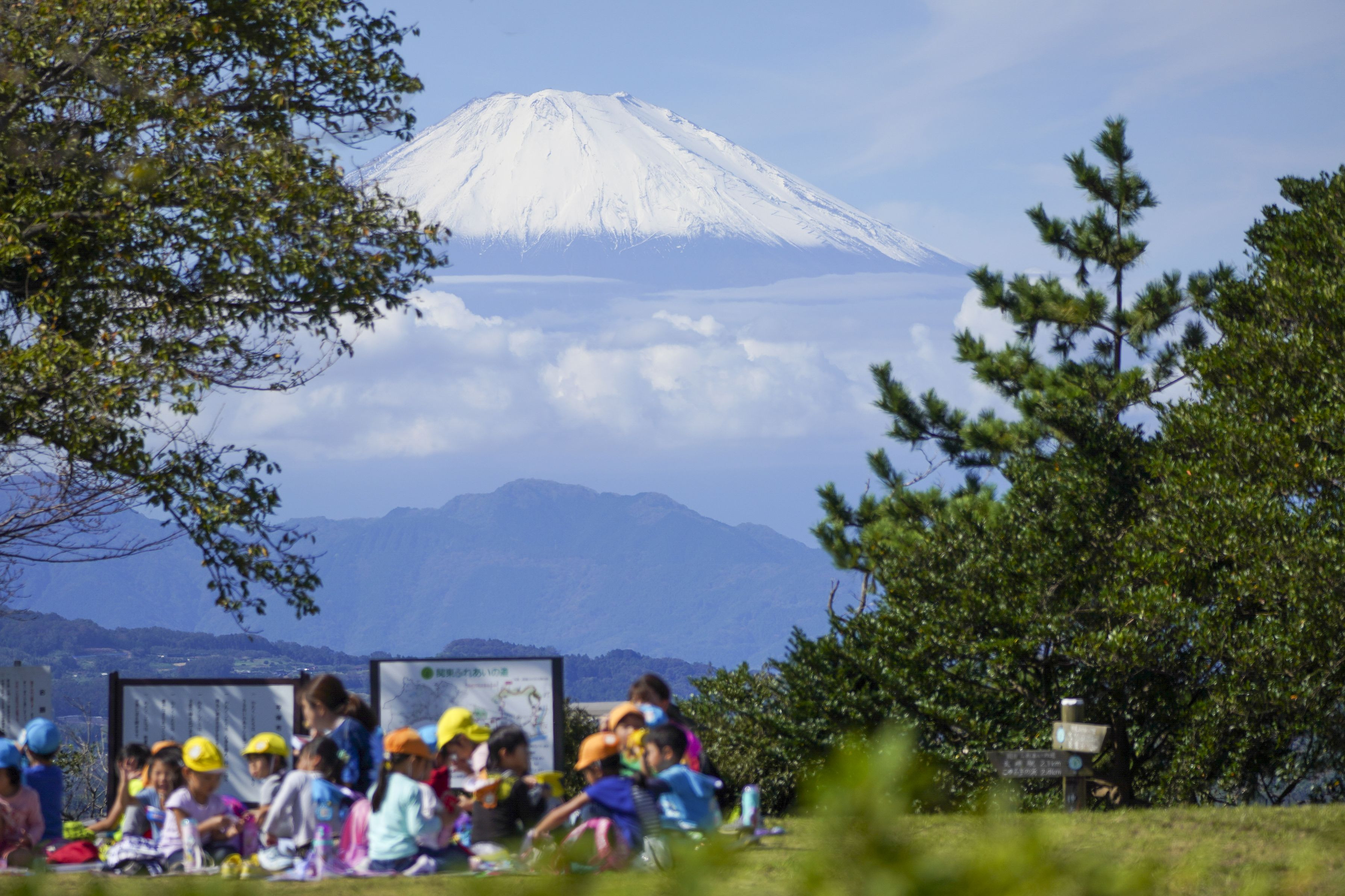 「園長先生!」「○○先生!」と、大きな声で園児たちの声がこだまする。 屈託のない元気な様子で、明るい笑顔がとても印象的。例年より22日遅れの富士山初冠雪が報道された翌日の課外授業だろう。園長先生の園児たちへの愛情が深く感じられる出来事に遭遇。そこで、タイトルは「園長先生の思いをそのまま表現」した。 (2019.10.23撮影・湘南平・神奈川県平塚市)