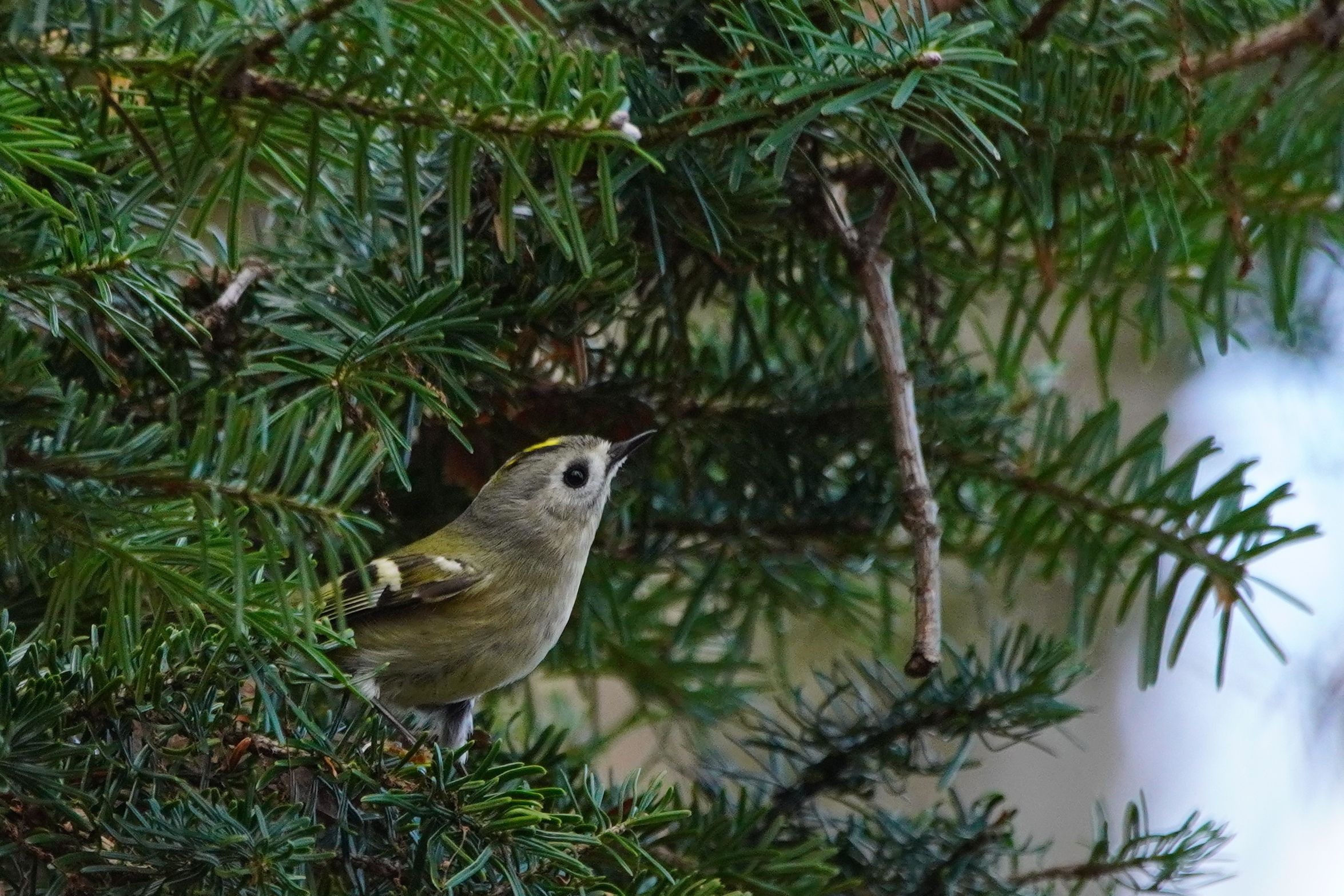オオマシコ出現を待っていると、かぼそいけど騒がしい聞き覚えのある声が聞こえて来た。近くのモミの木?の上の方でホバリングする姿が・・・やはり、キクイタダキだった!#キクイタダキ#