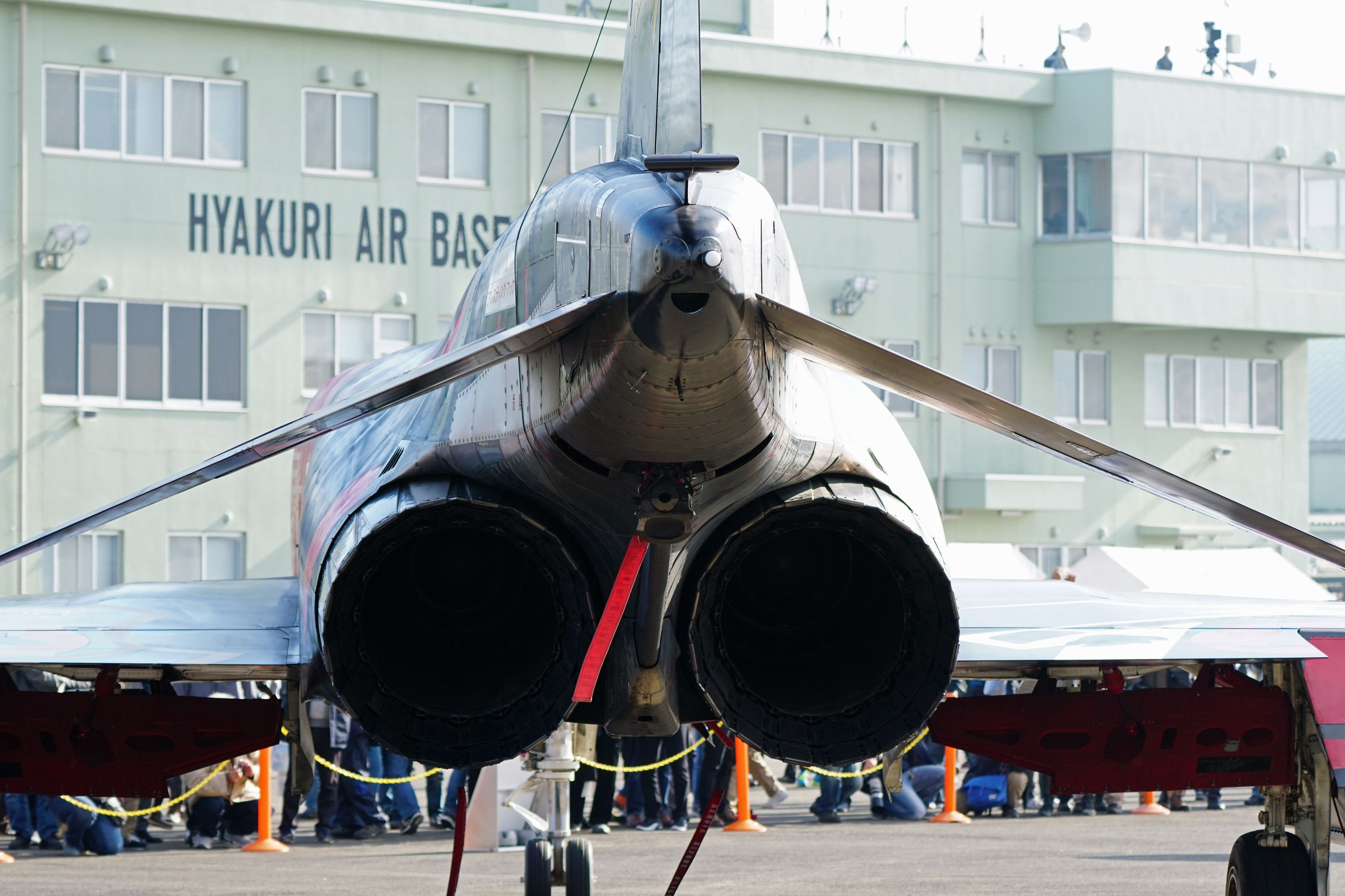 ファントムの特徴といえば、なんといっても先下がりの水平尾翼。ご覧のように水平尾翼は水平ではなく、垂直尾翼と水平尾翼がちょうど、円周を1/3にしているように見えます。 疑問点、アレスティングフックに赤い札は何?、垂直尾翼の付け根の黒い水平部分は何?
