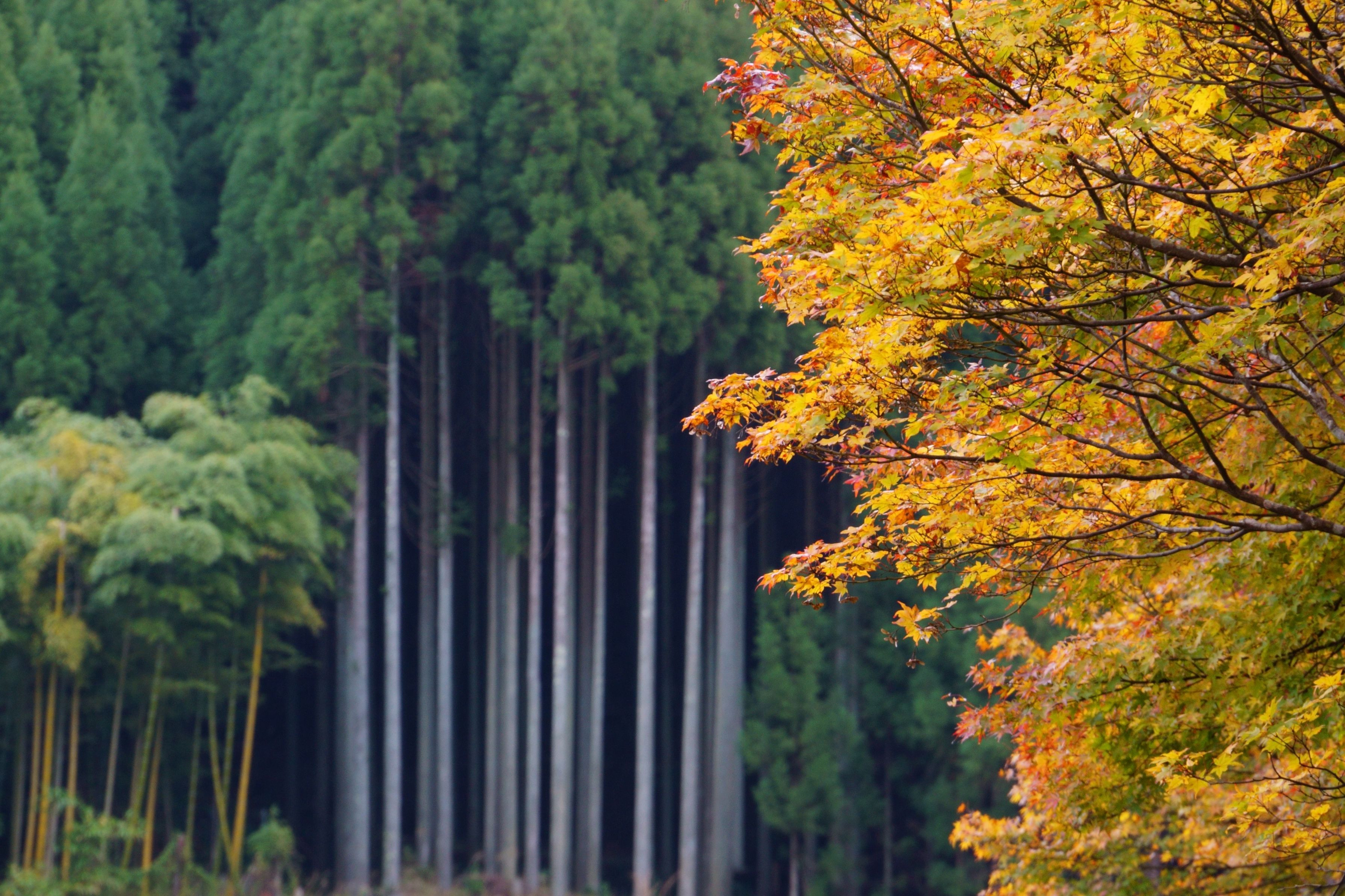 高雄にて 北山杉の本場ではありませんが枝打ちされた木立ちに紅葉が鮮やかでした