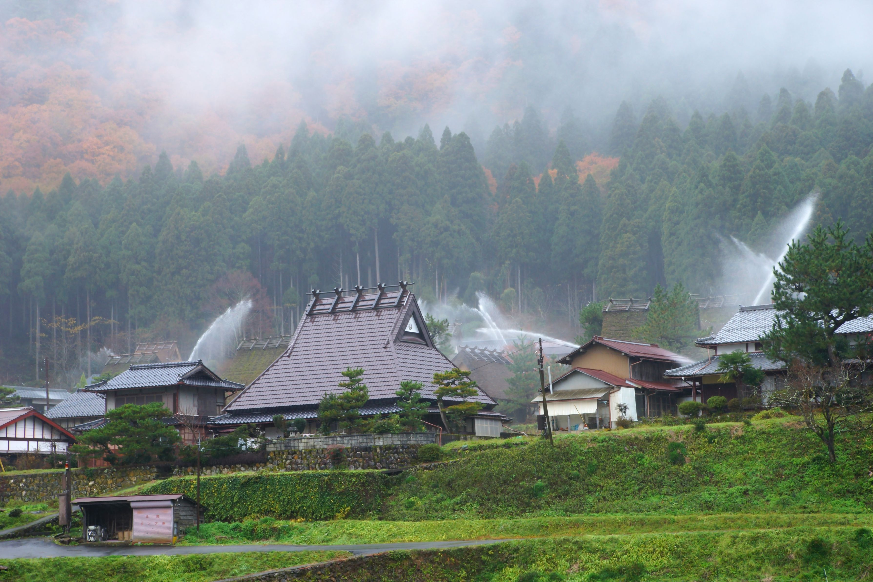 20191202-DSC04825 京都府 南丹市美山町かやぶきの里 日本の原風景 防火訓練の放水銃の一斉放水