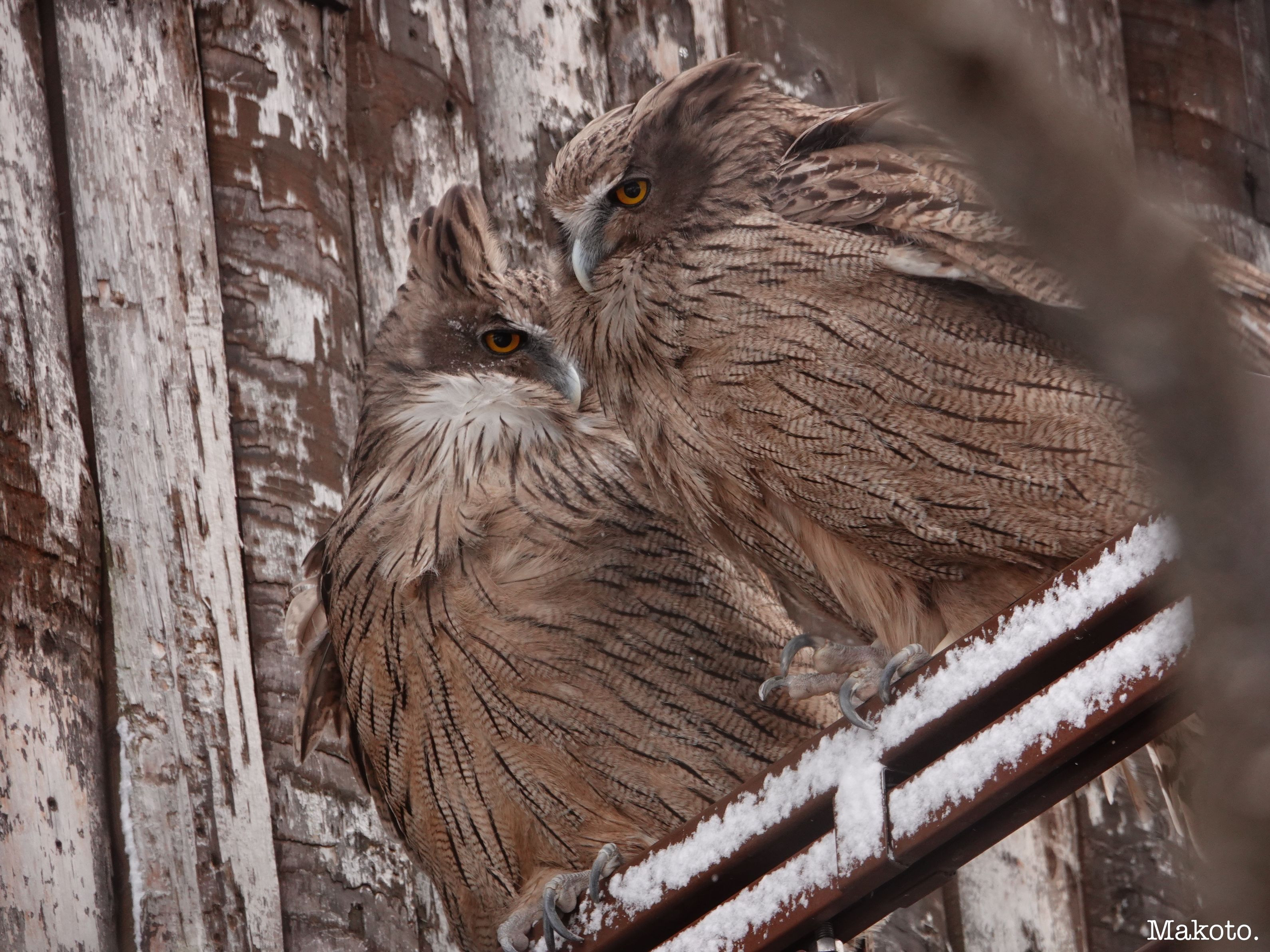 風が強かったせいか、寄り添ってました。 モフモフだけど、フクロウだって寒いよね。